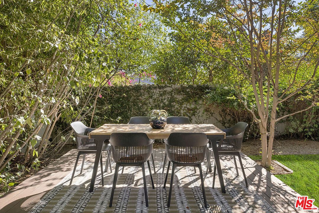 A cozy outdoor dining space is set on a wooden deck surrounded by lush, leafy trees that create a natural canopy overhead. The rectangular table in the center seats six, with black, modern slatted chairs providing a sleek contrast to the greenery. Beneath the table is a geometric-patterned outdoor rug in muted earth tones, adding warmth and texture to the area. Natural light filters through the leaves, casting dappled shadows on the ground. A concrete planter with a leafy plant serves as the table’s centerpiece. The space feels private, tranquil, and ideal for alfresco meals or gatherings.
