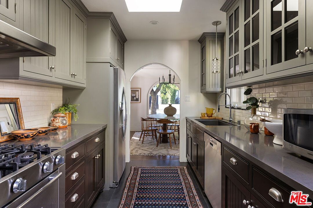 A long, narrow kitchen features deep gray cabinets with silver hardware and glass doors on the uppers, complemented by pale subway tile backsplash and sleek gray countertops. Stainless steel appliances, including a large refrigerator and gas stove, add a modern touch. An oriental runner rug softens the dark slate floor. The arched doorway at the end of the kitchen frames a glimpse into the adjoining dining area, where a large ceramic vase sits center on a round wooden table surrounded by mid-century chairs on a patterned rug. White walls and a skylight create a bright, inviting atmosphere with subtle vintage charm.