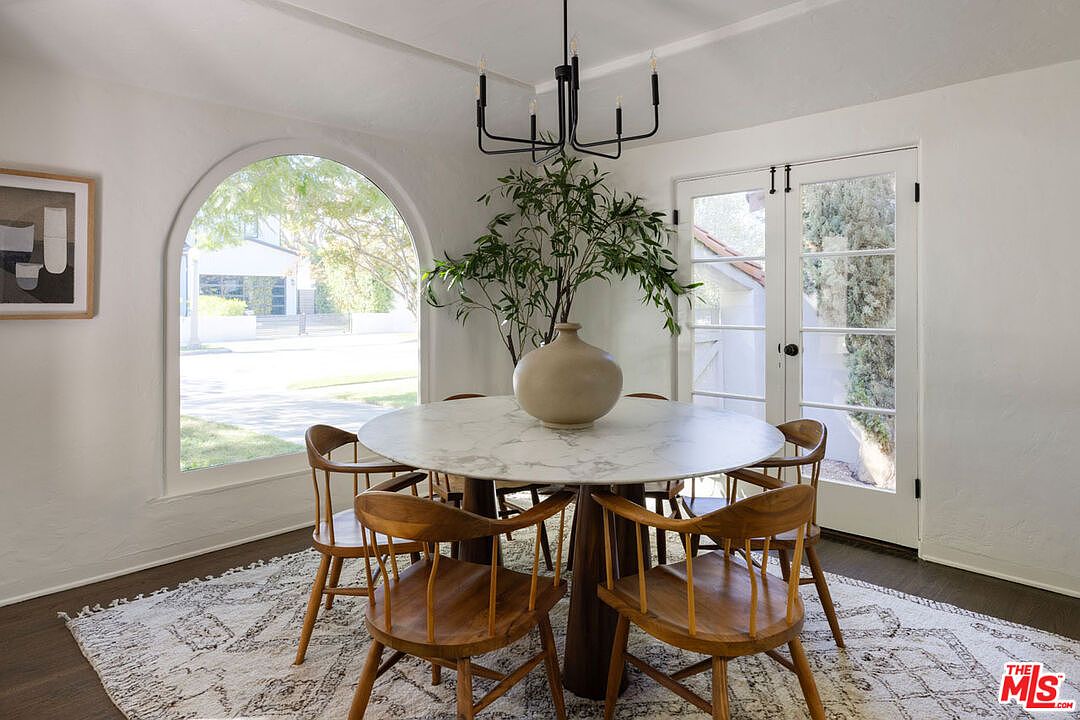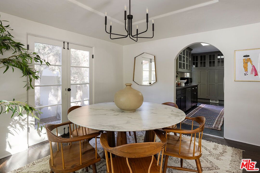 A bright dining room features a round, white marble-top table surrounded by six mid-century wooden chairs placed on a textured beige rug. French doors to the left let in ample natural light and offer a view of lush greenery outside. A potted leafy plant adds fresh green tones to the neutral space. The walls are painted a soft off-white, contributing to the airy feel. A modern black geometric chandelier hangs from the ceiling. A large ceramic vase sits on the center of the table. Through an arched doorway, muted green cabinetry and a vintage runner hint at an adjacent kitchen with classic character.