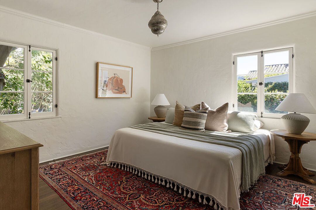 A cozy bedroom features a large bed dressed in a cream coverlet with tasseled edges and topped with striped and solid throw pillows in earthy tones. Two round wooden side tables with matching sculptural bases hold white ceramic lamps with pleated shades flanking the bed. Sunlight streams through two sets of paned windows, one on each wall, bathing the white textured plaster walls in natural light. A colorful red and navy Persian-style rug adds warmth and pattern to the dark wood floor. Above the bed sits a single framed artwork, and a unique vintage pendant light hangs from the ceiling, tying the space together.