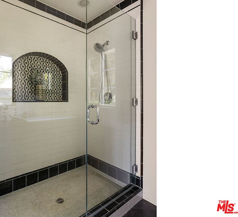 A glass-enclosed shower features crisp white subway tiles accented by bold black border tiles, giving the space a crisp, classic appeal. The focal point inside the shower is an arched niche with elegant black-and-white patterned tile, providing both storage and stylistic contrast. The showerhead and handle are metallic, contributing a modern touch that blends with the traditional tilework. Natural light enters through a window outside the shower, brightening the interior. The floor is finished with small, light-toned tiles and a central drain, completing the room’s clean, sophisticated look.