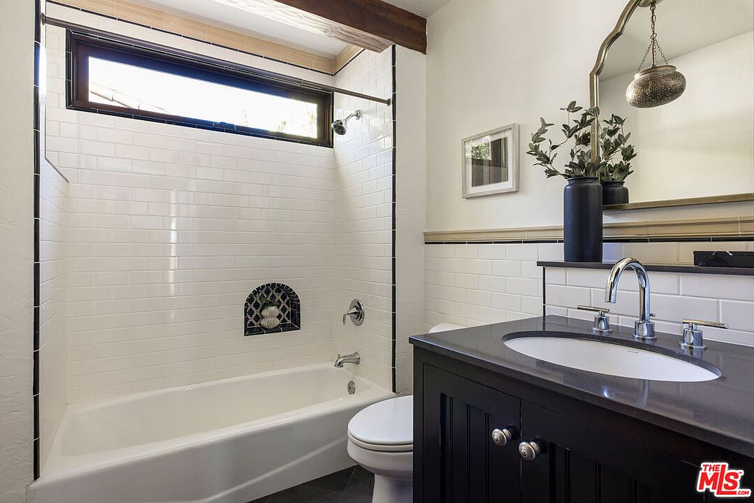 A compact bathroom with a classic and clean aesthetic, featuring white subway tile walls surrounding a built-in bathtub. The tub area includes a charming black and white tiled niche above the faucet and a large horizontal window with a wooden beam above, bringing in natural light. The vanity is dark wood with a sleek, black countertop and silver fixtures, complemented by a large mirror and decorative vases with greenery. Subtle beige accent tile lines the walls midway, while a minimalist framed picture and pendant light add elegant finishing touches. The overall effect is bright, inviting, and thoughtfully detailed.