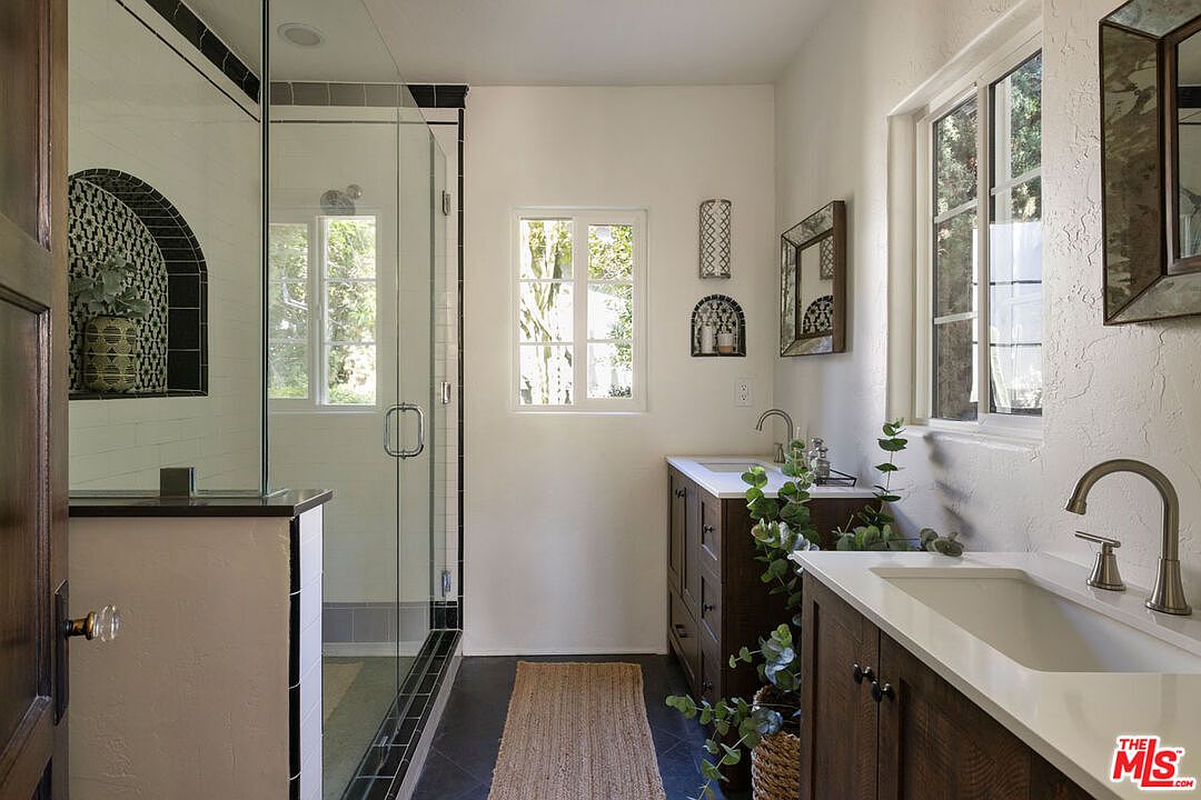 A serene bathroom featuring twin white sinks set in dark wood vanities, positioned under expansive multi-pane windows that allow natural light to fill the space. A large glass-enclosed walk-in shower with glossy white tiles and a black-tile border is on the left. The walls are creamy textured plaster. Plants sit atop the counters and in a wicker basket, adding a touch of greenery. Artistic wall niches and a decorative mirror enhance the historic charm, while a natural woven rug lies on the slate floor, tying the classic and fresh elements together.