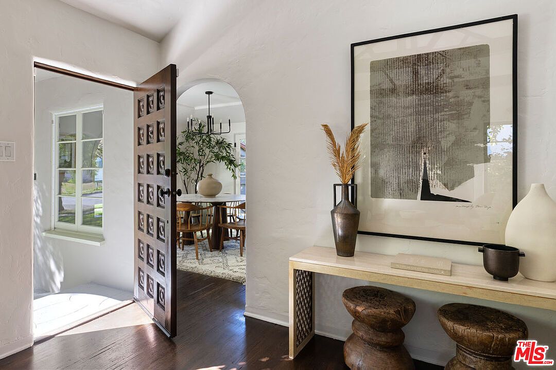 A sunlit entryway features a dark, solid wood front door with geometric carved detailing that contrasts beautifully with the crisp, white plastered walls. To the right of the door, a narrow console table in light-colored wood sits beneath a large abstract artwork in a black frame. On the console are decorative vases—one filled with dried grasses—adding an organic touch. Two small, round wooden stools are tucked underneath. An arched doorway leads into the dining room, where a large potted plant, a circular chandelier, and a group of wooden chairs around a dining table are visible. The space feels airy, warm, and welcoming.
