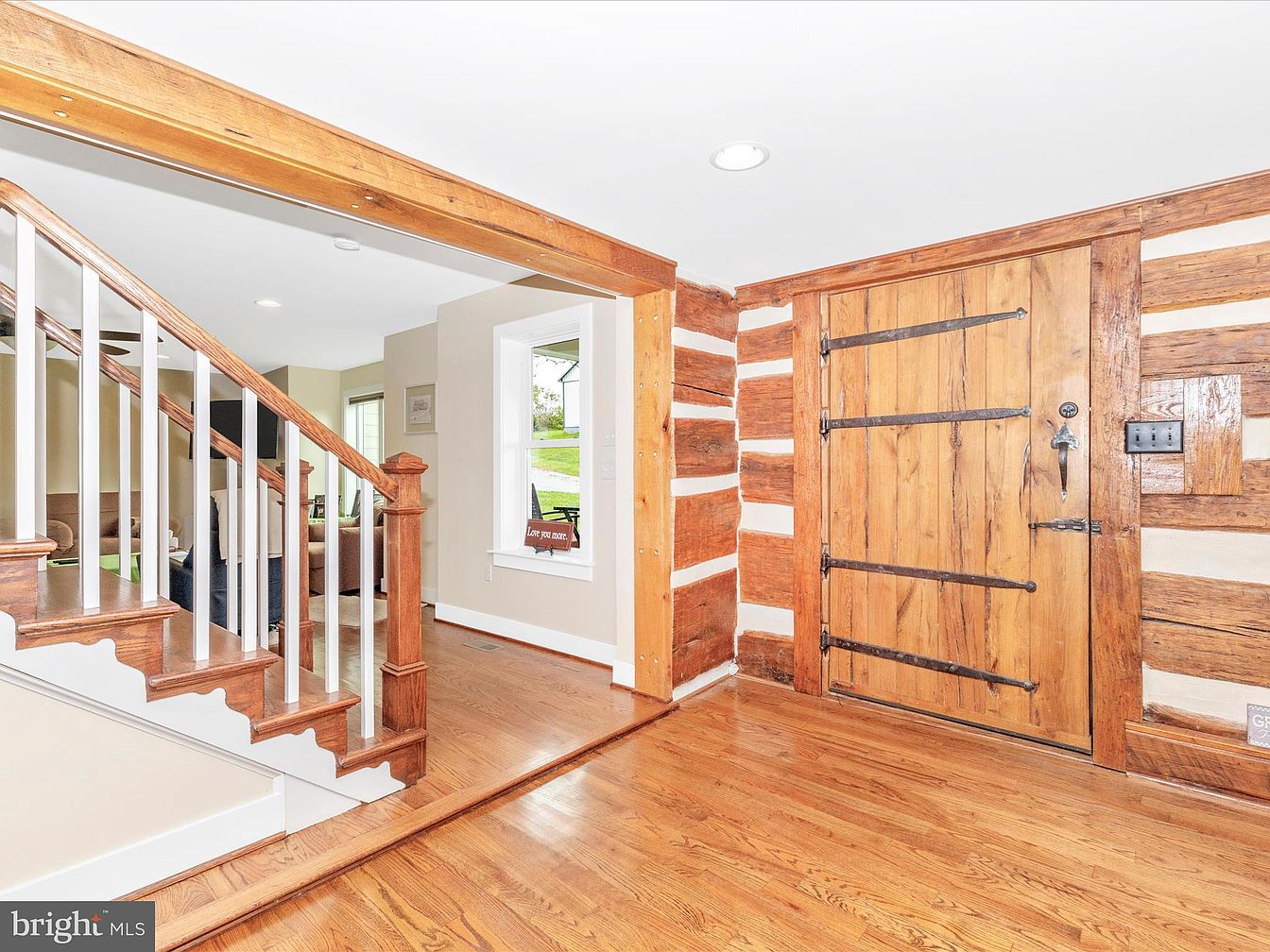 The entrance hallway features an inviting wooden door with rustic iron detailing, adding historic charm. The log cabin-inspired wall presents a warm blend of wooden beams and white plaster, enhancing the room’s traditional aesthetics. Rich, polished hardwood floors reflect natural light, contributing to a bright atmosphere. A prominent staircase, with its contrasting white banister and dark wood steps, leads to the upper level. Adjacent to the door, a window allows outdoor views, creating a seamless connection to nature. The overall design seamlessly blends classic elements with modern touches, maintaining a welcoming and cozy feel.