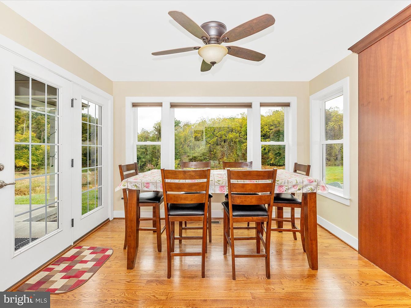 Natural light floods this cozy dining area, accentuated by large windows overlooking a lush landscape. The warm, honey-toned hardwood flooring complements the earthy tones of the walls, while a modest ceiling fan adds a touch of comfort. A rustic wooden dining table is surrounded by matching chairs, each featuring dark, cushioned seats. A floral tablecloth brings a subtle charm to the space. French doors provide access to the outdoors, enhancing the welcoming atmosphere. The entire layout emphasizes openness, inviting gatherings with family and friends, creating a perfect blend of comfort and elegance in this inviting home nook.