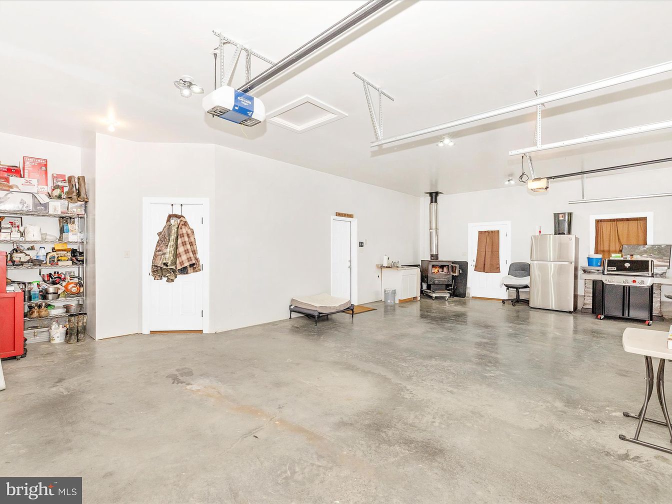 This spacious garage features a smooth concrete floor and ample overhead lighting, creating a bright and functional environment. The walls are painted a clean white, promoting a sense of openness. To the left, a shelving unit holds various tools and items, showcasing a mix of functional storage solutions. A cozy wood stove offers warmth, while a modern refrigerator stands near the work area, indicating a dual-purpose space. In the center, a simple foldable table and a comfortable chair add functionality. Two doors lead to separate areas, enhancing accessibility and flow, while brown curtains provide a touch of warmth.