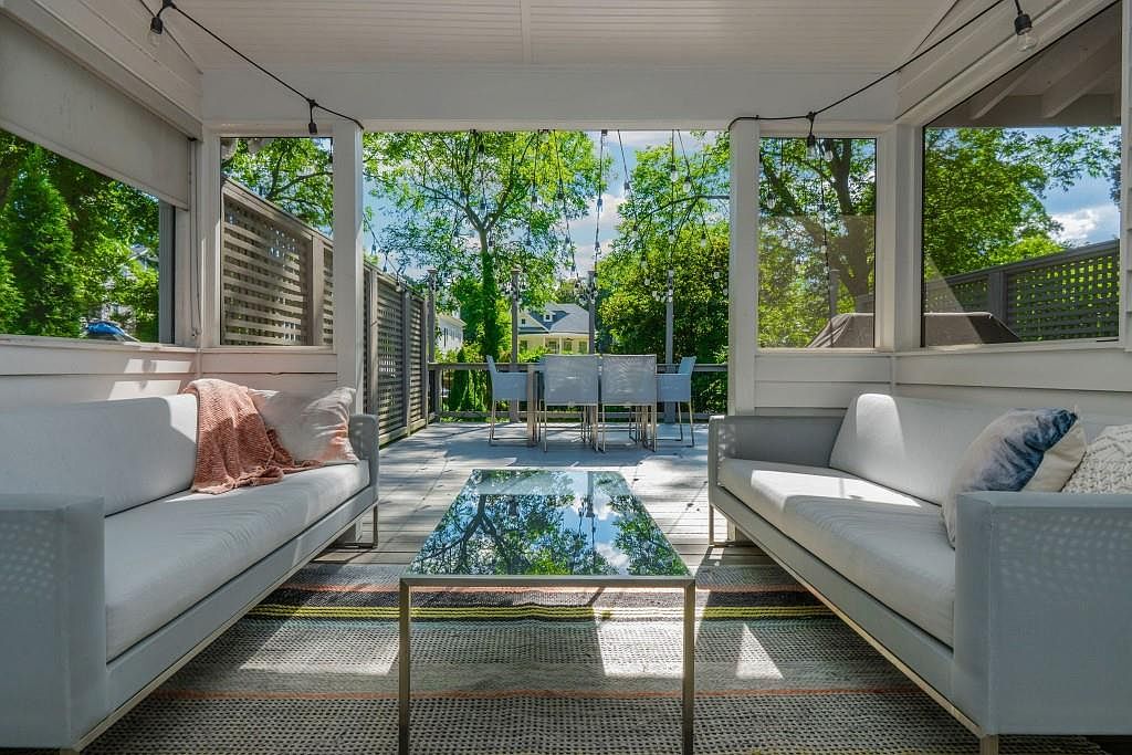 A spacious screened porch features two modern, light gray sofas facing each other, each adorned with plush accent pillows in soft hues of blush and blue. Between the sofas, a reflective glass-topped coffee table sits atop a textured, woven rug with subtle stripes, adding warmth and color to the seating area. Above, simple string lights hang along the white-paneled ceiling. The space opens out to a sunlit deck with a contemporary outdoor dining table and chairs, framed by wooden privacy lattices and surrounded by lush trees, allowing for a serene indoor-outdoor connection and inviting natural light throughout.