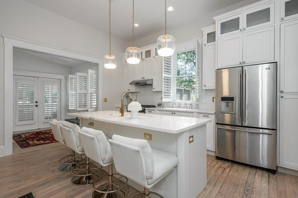 Bright, airy kitchen features a large marble island with seating for four on plush, white-upholstered stools with gold bases. The cabinetry is classic white Shaker-style with silver hardware and extensive upper cupboards extending to the ceiling for ample storage. Stainless steel appliances, including a gas stove and a double-door refrigerator, add a modern touch. Warm, light-toned wood flooring complements the crisp white palette. Elegant globe pendant lights hang above the island, providing soft illumination. Large windows with plantation shutters allow natural light to flood the space and brighten the clean, sophisticated aesthetic.