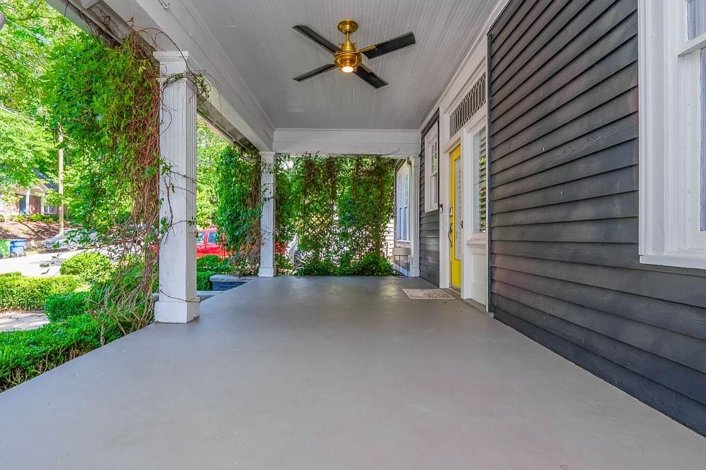 A wide, covered front porch featuring smooth gray flooring and white ceiling with a modern brass and black ceiling fan. The exterior wall on the right is dark gray with white-trimmed windows, and the entry door is painted a cheerful yellow, framed in white. White columns line the edge of the porch, partly wrapped in green climbing vines, adding natural charm and a sense of privacy. Hedges and mature trees are visible in the background, providing a lush, welcoming setting for the home’s entrance. The aesthetic blends historic charm with subtle modern touches.