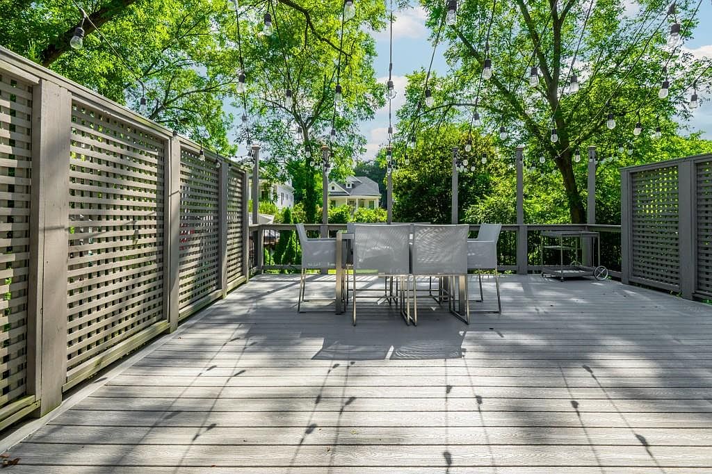 A spacious outdoor patio features a clean-lined modern dining set with six white mesh chairs and a sleek rectangular table at the center. The deck flooring is finished in a soft gray tone that complements the surrounding lattice privacy screens, also painted gray. Overhead, strings of round bulb lights crisscross the area, creating a festive ambiance. The space is open to lush greenery, with mature trees providing partial shade and glimpses of neighboring homes in the distance. The overall atmosphere is airy and contemporary, perfect for casual al fresco dining or gatherings in a tranquil, leafy setting.
