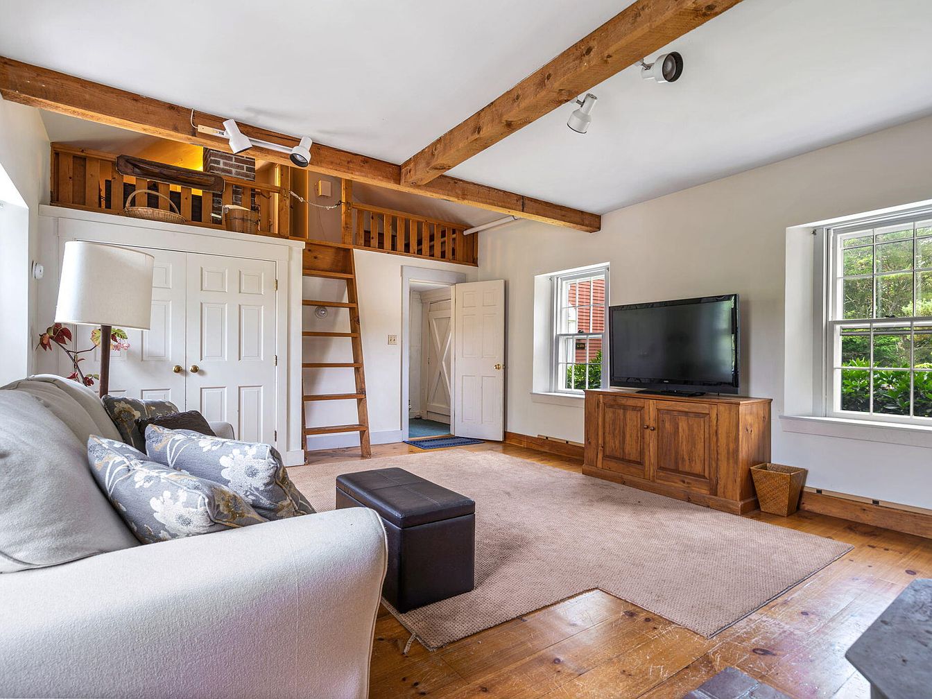 This inviting family living room features natural wood beams that add rustic charm, paired with light-colored walls for a bright and airy atmosphere. The spacious seating area includes a soft beige couch with floral-patterned cushions, fostering comfort for gatherings or relaxation. A large area rug covers the warm wooden floors, ideal for children to play. The room is enhanced by abundant natural light streaming through two wide windows, providing cheerful views of greenery. A wooden entertainment cabinet with a flat-screen TV offers family movie nights. An eye-catching loft area above, accessible by a wooden ladder, creates additional play or storage space, adding a fun, family-friendly aspect to the design.