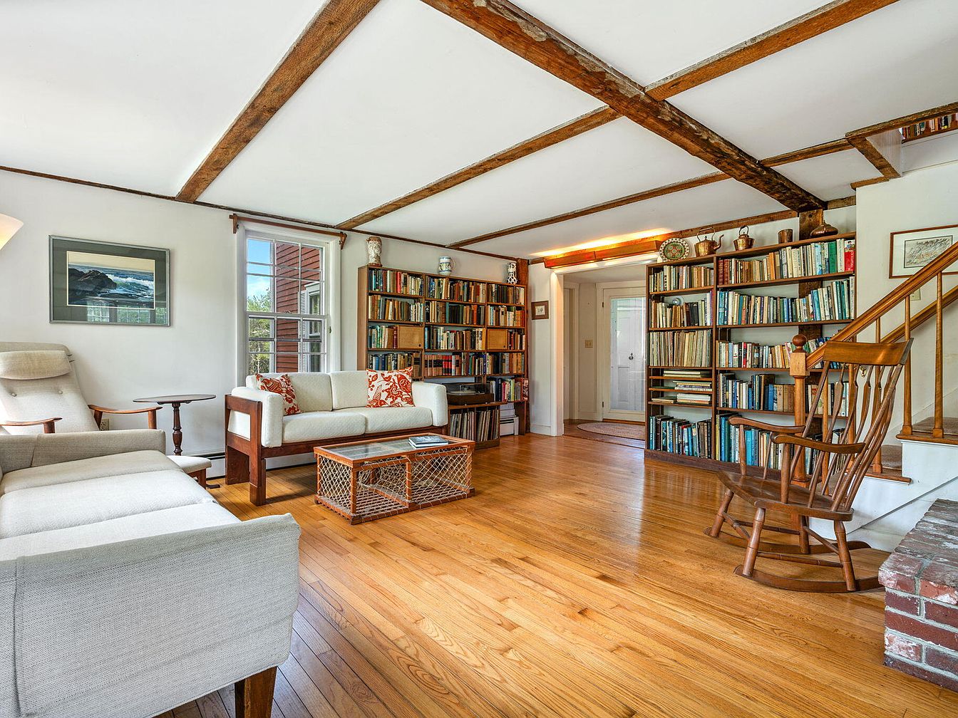 Warm wood floors run throughout a bright living room, highlighted by exposed wooden ceiling beams that add rustic character. Two comfortable armchairs and a loveseat are grouped around a simple coffee table, encouraging conversation or family gatherings. A large wall filled with bookshelves houses an extensive collection of books, giving the space a cozy, inviting atmosphere perfect for readers and children alike. Sunlight streams in through generous windows, brightening the room and creating a cheerful ambiance. The staircase with wooden accents provides easy access to the upper level, while thoughtful touches like framed artwork and decorative pottery add personality and a homely charm.