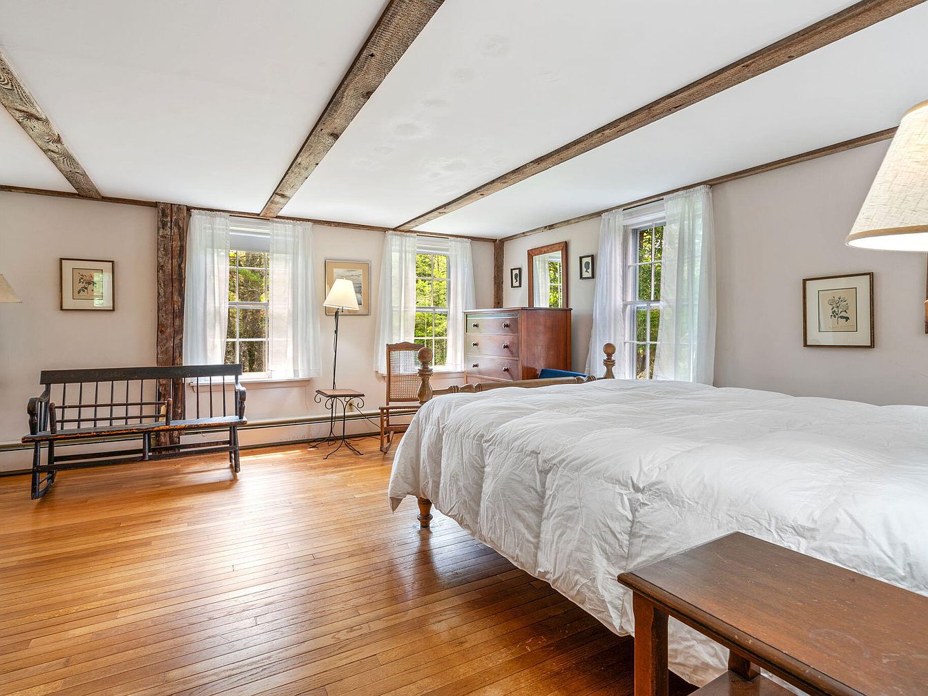 Spacious and bright, this bedroom features wide plank hardwood floors and rustic ceiling beams that add warmth and character. Three large windows let in abundant natural light, framed by sheer white curtains for airy elegance. The light beige walls are accented with simple botanical prints, enhancing the calm and inviting atmosphere. Furnishings include a classic wooden bed with crisp white bedding, a matching bench at the foot, a sturdy wooden dresser, an antique spindle-back bench, and a woven chair, offering plenty of seating and storage. The generous floor space ensures a safe area for children to play or for the whole family to gather.