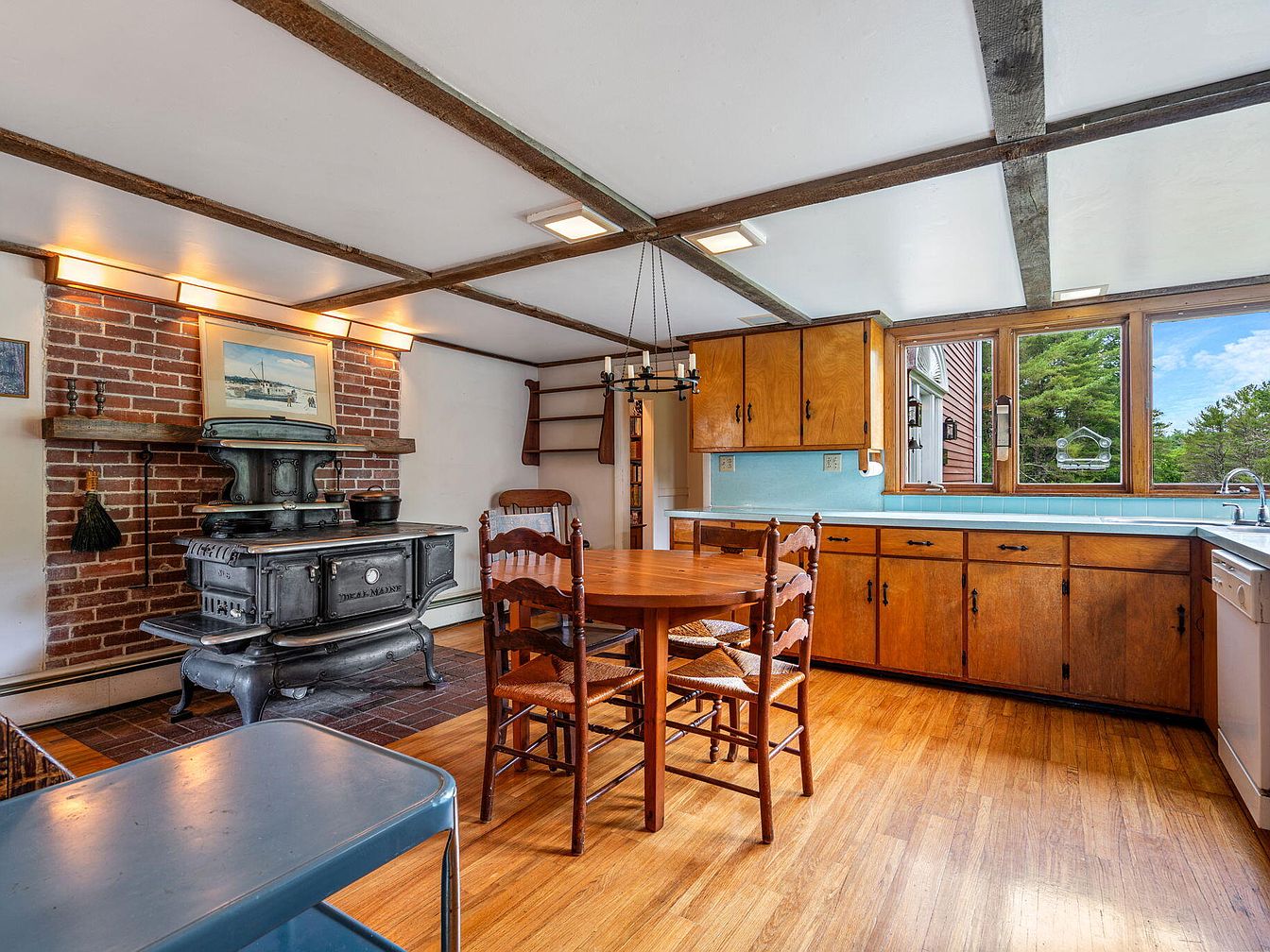 A bright and inviting kitchen dining space with a retro, family-friendly charm. The central feature is a round wooden dining table with four matching chairs, perfect for shared meals. The kitchen cabinetry is finished in warm, honey-toned wood, complemented by a light blue backsplash that runs beneath expansive windows, flooding the area with natural light and offering peaceful outdoor views. Rustic ceiling beams and a classic brick accent wall with a vintage cast-iron stove add timeless character and coziness. The hardwood floors provide durability for busy family life, while open shelving and ample counter space promote convenience and togetherness.