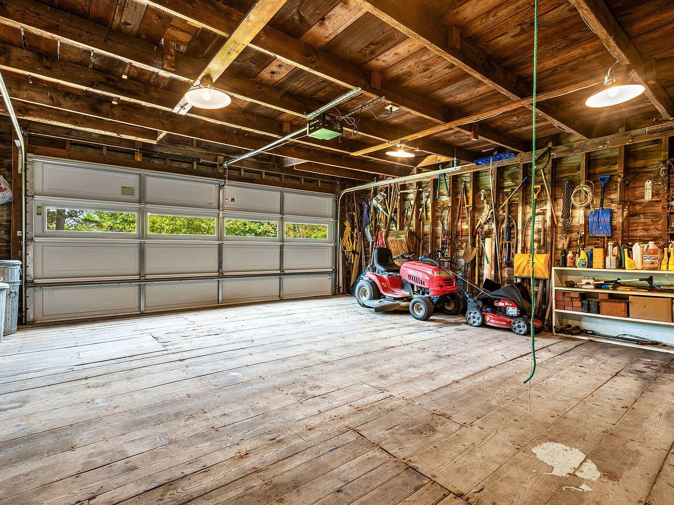 Spacious garage featuring exposed wooden beams and natural wood floors, creating a rustic and warm atmosphere. The walls offer abundant storage with an organized assortment of tools and garden supplies neatly hung, making it easy for families to maintain order and enjoy DIY projects. There are two lawn mowers parked neatly against the side, and open shelving provides additional storage for household goods and equipment. A large automatic garage door with horizontal window panels lets in natural light, enhancing visibility. The open floor area offers flexible space for parking vehicles, bicycles, or setting up a workspace, supporting various family activities and hobbies.