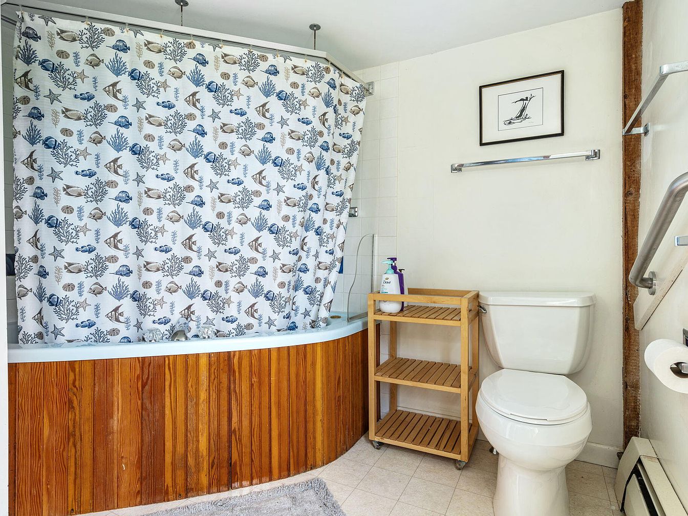 This thoughtfully designed bathroom features a spacious alcove tub with a cozy wood panel front and a whimsical shower curtain adorned with sea creatures and corals in soothing blues and tans, adding a playful touch that appeals to children. The walls are painted a soft cream shade and accented by exposed wooden beams, giving the space a warm, inviting feel. Practical touches for families include sturdy safety grab bars, a convenient towel rack, and a portable wooden shelving unit beside the modern white toilet. Simple framed artwork, neutral tile flooring, and a plush gray bath mat contribute to its bright, comfortable, and functional atmosphere.