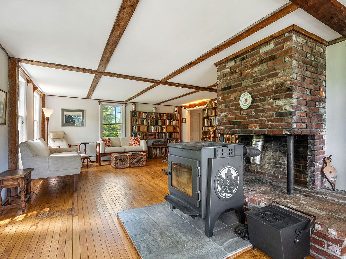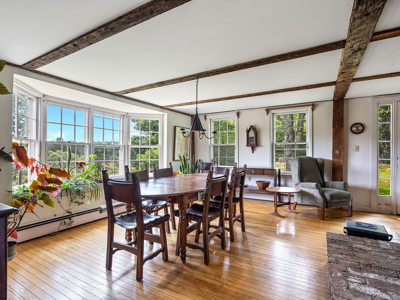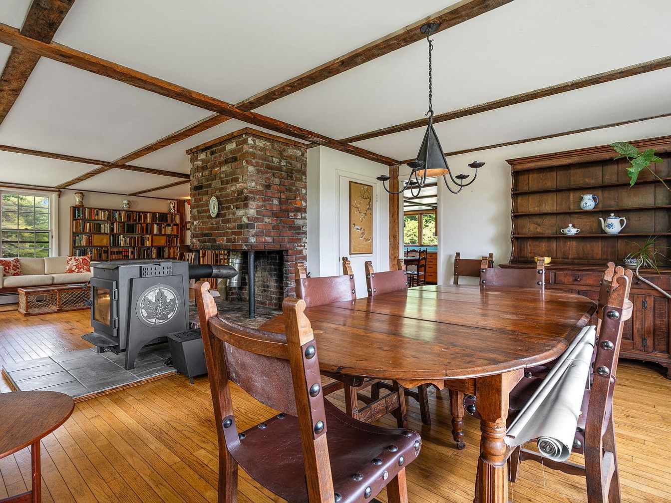 Spacious open-concept dining and living area blends classic and rustic design elements, perfect for family gatherings and everyday living. Wide-plank hardwood floors and exposed wood ceiling beams create warmth throughout the room. The large wooden dining table is surrounded by sturdy, high-backed chairs, while a matching hutch displays decorative china and a potted plant. A cozy sitting area features a plush beige sofa with patterned red pillows. An inviting wood stove sits against a central brick chimney, providing a focal point for the space and a source of warmth. Large picture windows fill the area with natural light, showcasing family-friendly comfort and versatility.