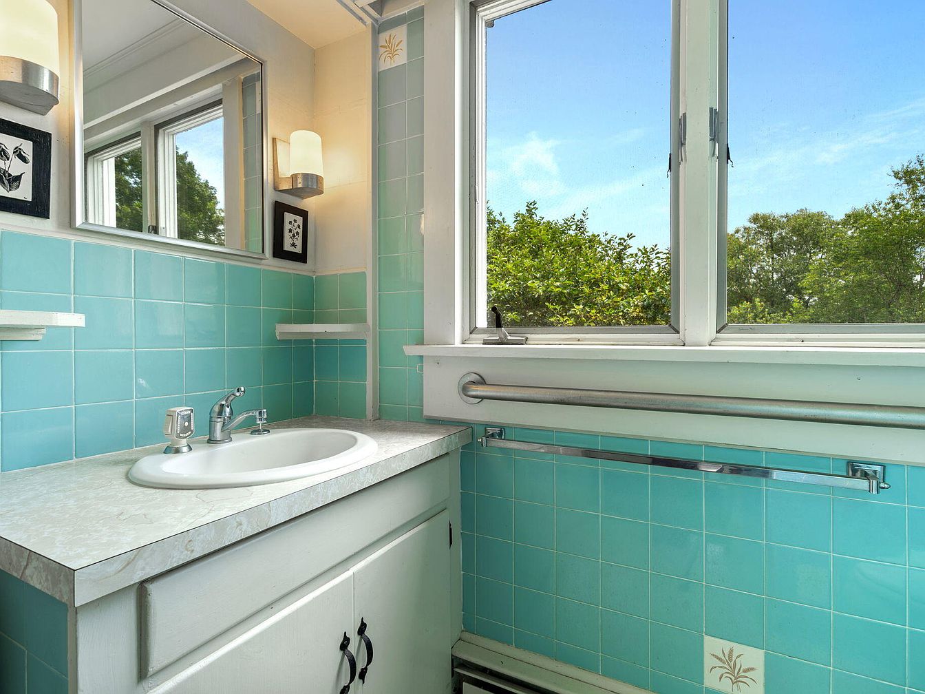 A bright and inviting bathroom vanity features a vintage style with soft turquoise ceramic tiles along the walls and a spacious white countertop. The built-in sink sits under a wide window that allows natural light to flood the room and offers a serene view of green trees outside. Sturdy chrome faucets and a practical railing provide added safety—ideal for families with children or elderly members. The cabinetry below is painted a light, calming shade to match the tile, and the fixtures are accented with sleek, modern lighting. Minimalist shelves and tidy decor add functional storage and visual appeal.