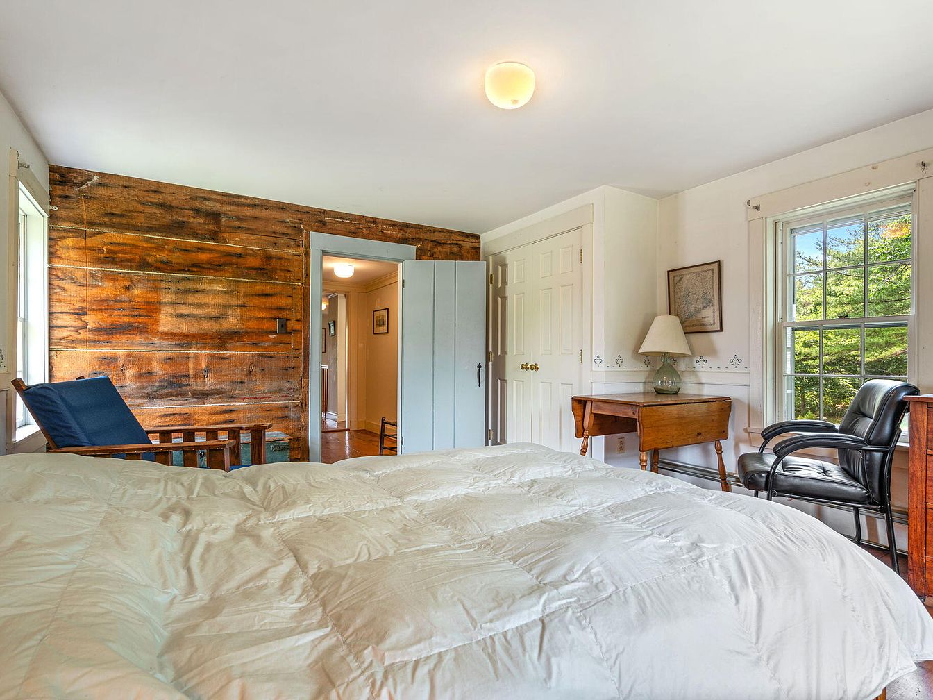 A spacious bedroom with a rustic yet inviting atmosphere, featuring a warm wooden accent wall and soft white walls that create a bright, airy feel. Large windows allow natural light to flood the room, offering views of greenery outside. The bed is draped in a plush white comforter, perfect for restful nights. Family-friendly furnishings include sturdy wooden chairs, a classic writing desk with a small lamp, and extra seating for lounging or family reading time. Thoughtful touches like framed artwork and a mix of vintage and modern furniture lend a sense of comfort, ideal for a family-oriented home.