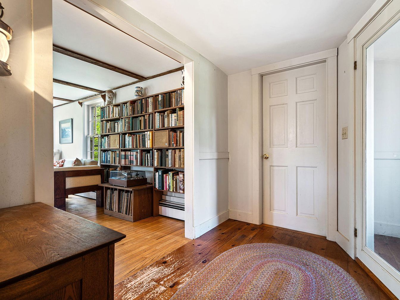 A cozy home library adjacent to an entry hallway is featured, with natural wood floors and warm, neutral wall colors creating a welcoming atmosphere. The library space offers a large wall of built-in shelves, filled with books and personal items, inviting a love for reading and family togetherness. Sunlight streams in from a window beside a comfortable reading nook with a soft couch, emphasizing the room’s brightness and comfort. The hallway includes a braided rug adding color and softness underfoot, while a wood cabinet and a mirrored closet door add functional elegance. Clean lines and classic detailing complete this inviting family space.