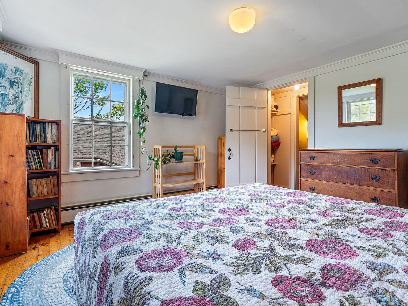 A bright and welcoming bedroom features a large window allowing ample natural light, creating an inviting and cheerful space perfect for a family. The bed is adorned with a floral-patterned quilt in shades of purple, green, and white, adding a cozy touch. Wooden furniture includes a classic dresser, a bookshelf filled with books, and a simple plant stand adding greenery. Architectural elements like polished hardwood floors and crisp white walls enhance the clean, peaceful atmosphere. The closet offers practical storage, while the television provides convenience for relaxation. The room’s gentle hues, natural materials, and organized layout make it family-friendly and comfortable.