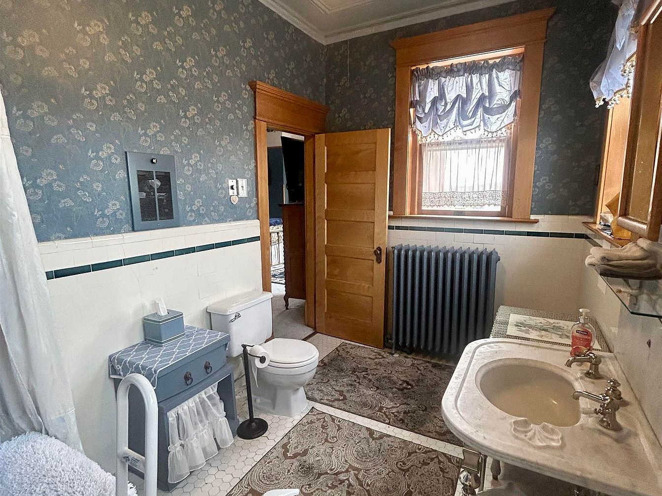 A spacious bathroom with vintage charm, featuring floral blue wallpaper and crisp white tile wainscoting accented by a slim green border. The window and door frames are crafted from warm, natural wood, creating an inviting and cozy atmosphere. Natural light filters through frilled blue curtains, adding softness and privacy. The space includes a white porcelain sink set in a marble-topped vanity, classic faucet fixtures, and a sturdy radiator for warmth. A well-placed rug, a blue side cabinet with an elegant tissue box, and a toilet with accessible support handles enhance the family-friendly design. Thoughtful touches ensure comfort and ease for all ages.