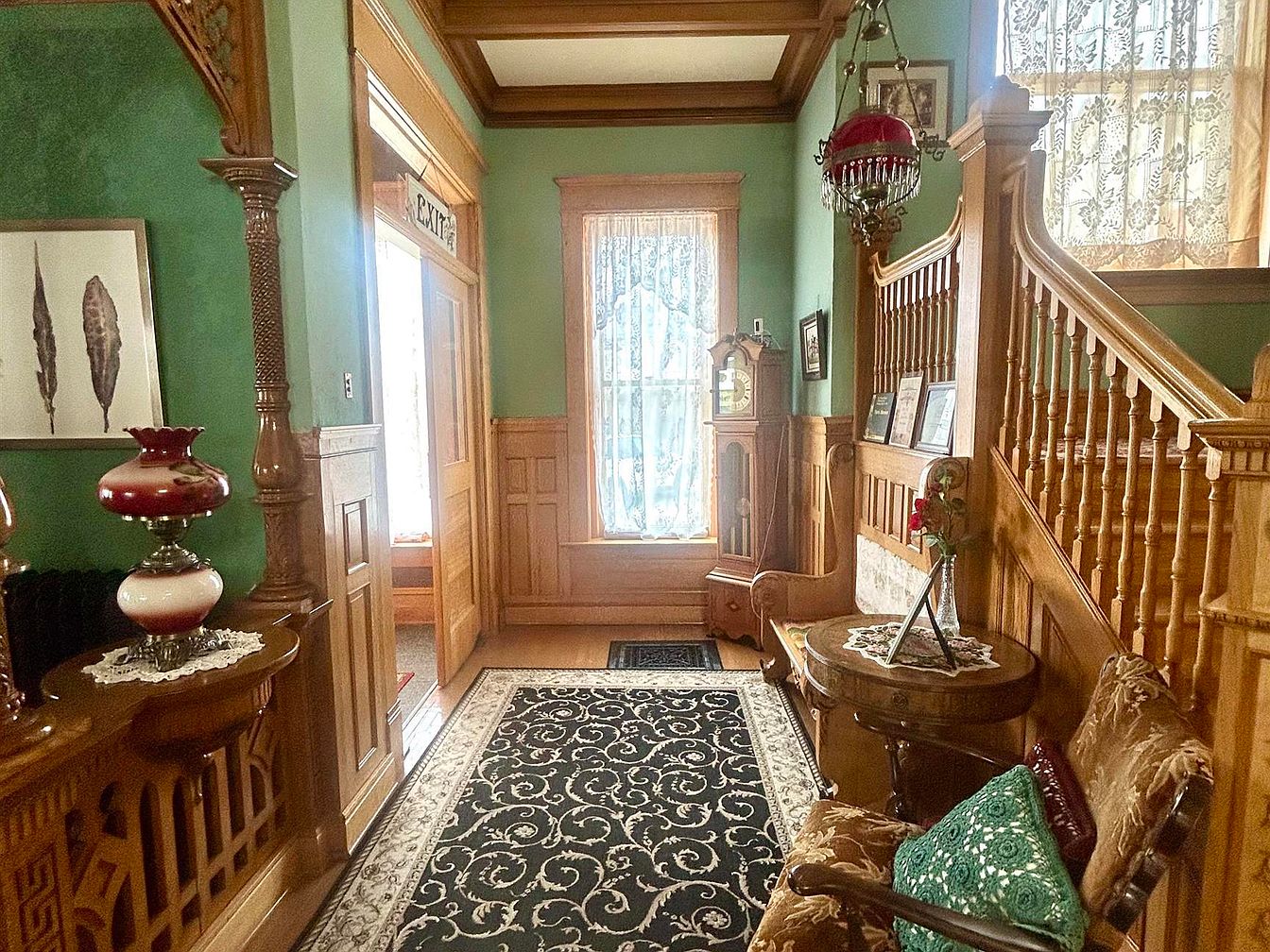 Warmth radiates from this inviting entryway, where rich woodwork frames the stair railings and lower half of the walls, paired with sage green upper walls. Natural light filters through delicate lace curtains on tall windows, casting soft shadows on the ornate patterned area rug. A grandfather clock and antique furniture, including a cushioned settee with a green crocheted pillow and an elegant wooden side table adorned with a flower vase, add timeless charm. The intricate detailing in the wood and vintage glass lamp create a cozy and welcoming atmosphere, ideal for families to gather and transition through the heart of the home.