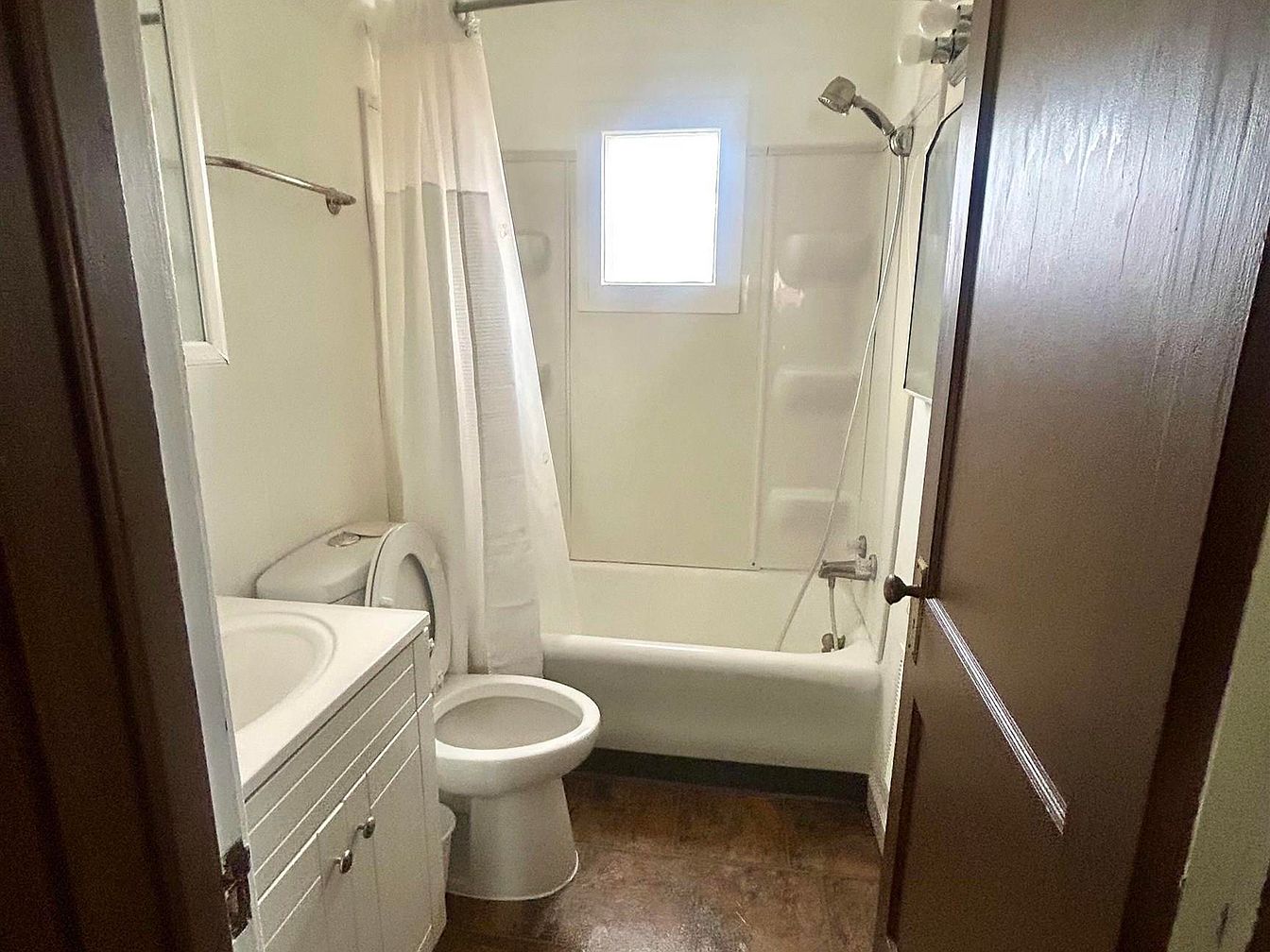 A compact, clean bathroom with a practical layout, perfect for family living. The space includes a white bathtub and shower combo at the back wall, fitted with shelving for toiletries and a sturdy shower curtain rod. A window above the tub allows natural light, making the room feel bright and inviting. To the left, a white vanity with built-in sink offers storage space underneath, while a modern toilet sits beside it. Neutral, light-colored walls and brown bathroom flooring provide a calming, easy-to-maintain environment, suitable for families of all ages. All fixtures are arranged for safety and convenience.