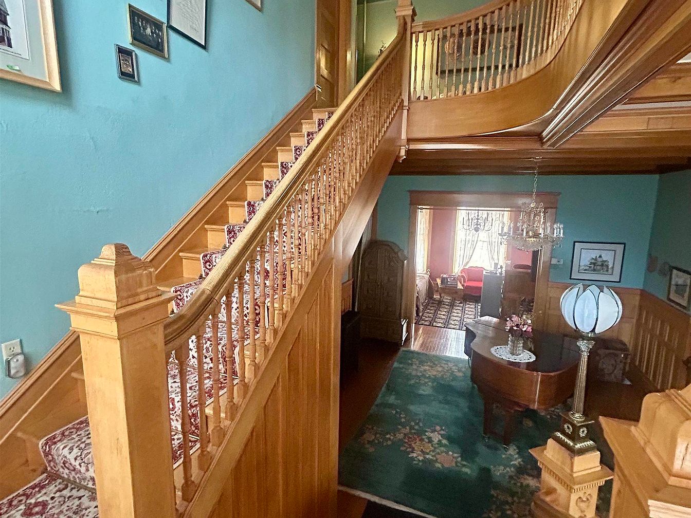 This space features a striking wooden staircase with ornate banisters and a patterned carpet runner, creating a welcoming path to the upper floor. The staircase opens to a spacious foyer adorned with pastel blue walls and light wood wainscoting, giving the area a bright and cheerful atmosphere. Below, a richly colored green floral rug covers the polished hardwood floor beneath a baby grand piano, ideal for family gatherings or music time. A vintage chandelier hangs overhead, paired with framed art and family photos that enhance the cozy, lived-in feel, making this a warm, family-friendly entryway.