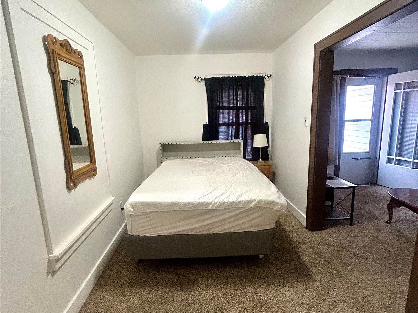 This cozy bedroom features warm, neutral tones with plush brown carpeting that extends into the adjacent room, offering a comfortable and inviting environment for families. The walls are painted soft white, creating a bright and airy atmosphere, complemented by a classic ceiling light. A grey upholstered bed with studded detailing takes center stage, with a small wooden nightstand and a simple lamp beside it for added functionality. A large, ornate wooden-framed mirror adds character and depth to the space. The room enjoys natural light from a window dressed in dark drapes, providing privacy and a peaceful retreat.