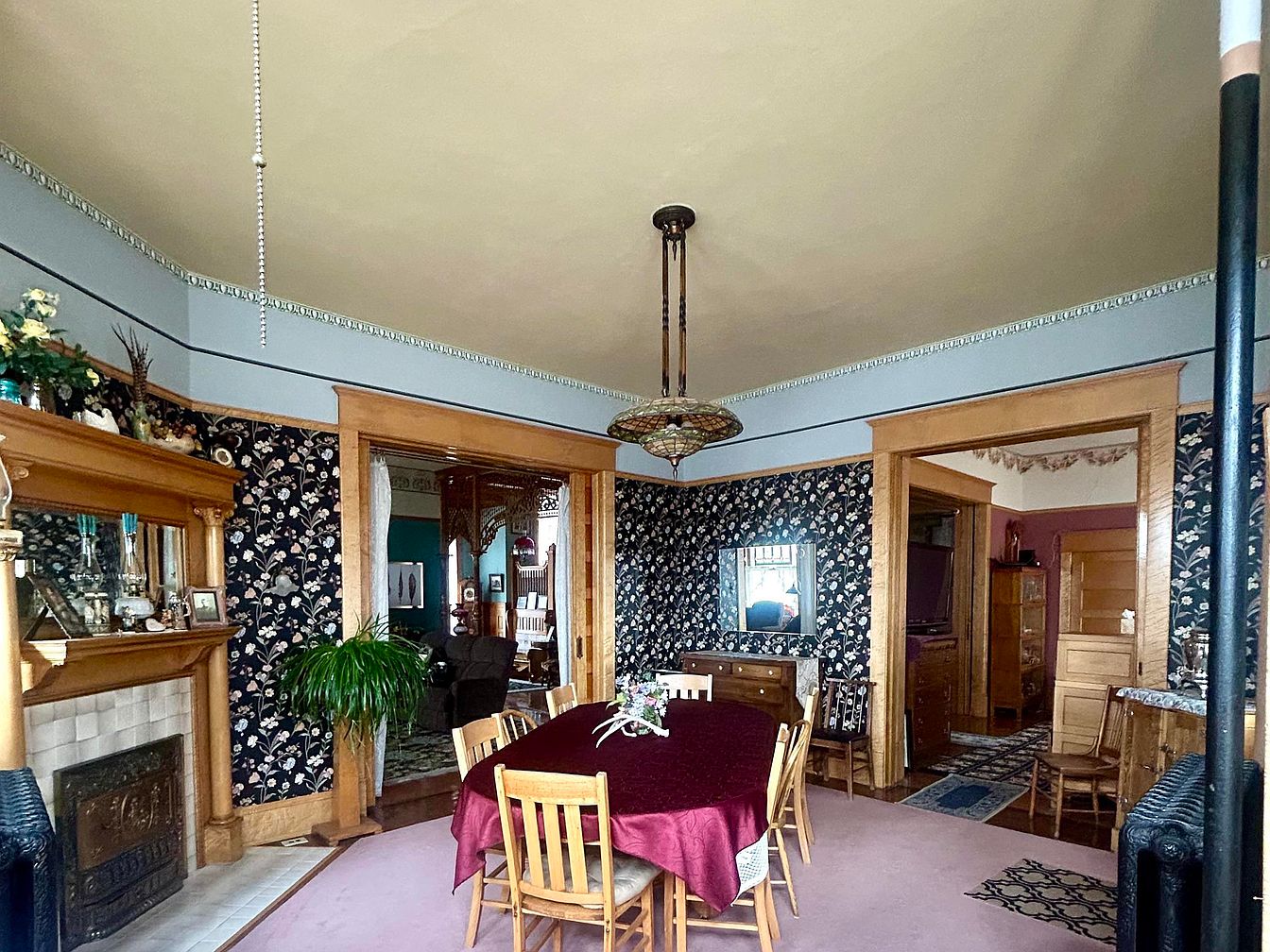 A spacious, elegant dining room ideal for family gatherings, featuring a large rectangular wooden table with a burgundy tablecloth surrounded by six wooden chairs. The room boasts vintage floral wallpaper in dark hues complemented by light blue trim and natural wood wainscoting, doors, and window frames. A decorative fireplace adorned with candles and family photos sits on one side, adding warmth and charm. The ceiling is a soft beige with an ornate light fixture hanging above the table. An abundance of natural light streams in from adjacent rooms, and houseplants add a touch of greenery, making this an inviting and functional space for all ages.