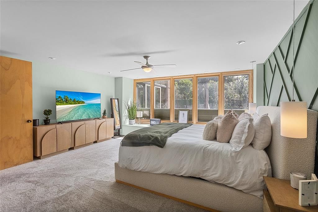 This bedroom focuses on a serene atmosphere with a light green wall and cozy carpet. A king-sized bed with a plush, textured headboard takes center stage, draped with white linens and a soft, olive green throw. A matching set of pillows adds to the inviting look. On one wall, a sleek, wooden cabinet houses a large television, complemented by a small potted plant. Large windows adorned with natural wood frames illuminate the space, providing a view of lush foliage outside. Architectural details include a stylish ceiling fan and unique diagonal wall patterns, enhancing the modern yet tranquil aesthetic.
