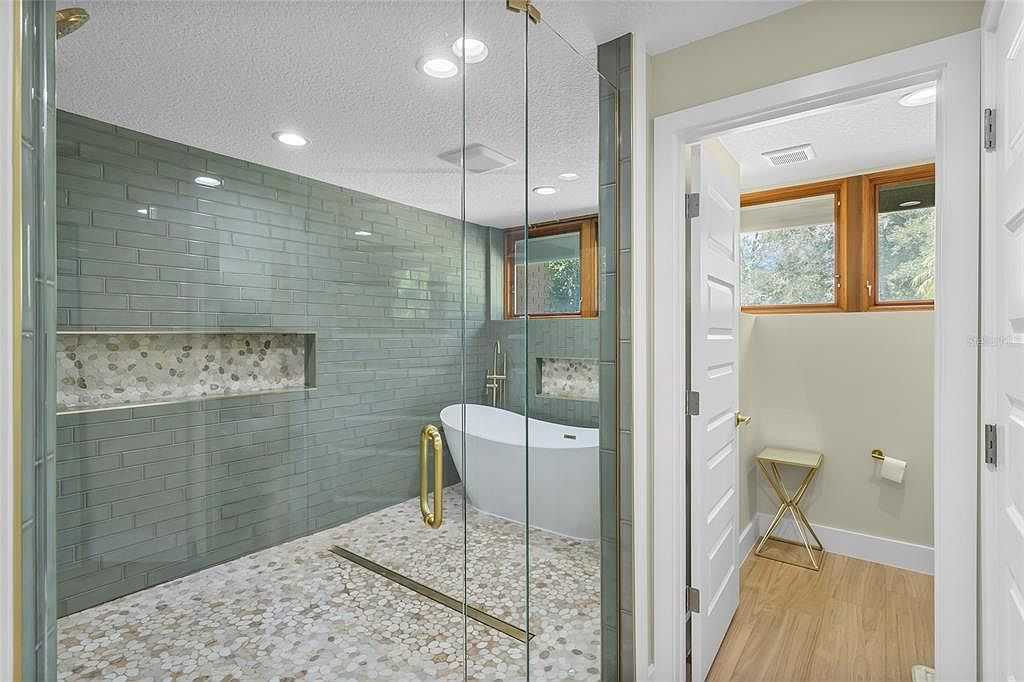 This bathroom showcases a sleek, contemporary design. The walls are adorned with textured, soft green tiles that create a calming ambiance. A spacious glass shower is featured prominently, with a minimalist brass shower handle. A freestanding bathtub, elegantly curved, is a focal point against the wall. Natural light floods the space through large windows, highlighting the unique pebble tile flooring that adds texture and interest. A built-in alcove provides an organized display for toiletries, enhancing both functionality and aesthetics. The warm wooden accents of the cabinetry and side table complement the cool color palette for a balanced look.