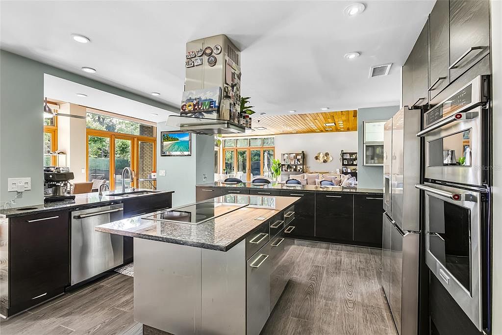 The kitchen showcases a modern aesthetic with a blend of dark cabinetry and stainless steel appliances. An expansive island features a striking granite countertop, providing substantial workspace and a gathering area. Large windows frame the room, inviting natural light and connecting indoor and outdoor spaces. The sleek lines of the cabinetry are complemented by minimalist hardware, creating a streamlined look. A cozy dining area with wooden accents can be seen through the open layout, emphasizing a welcoming atmosphere. The warm wood ceiling adds an organic touch, enhancing the overall contemporary feel of the space.