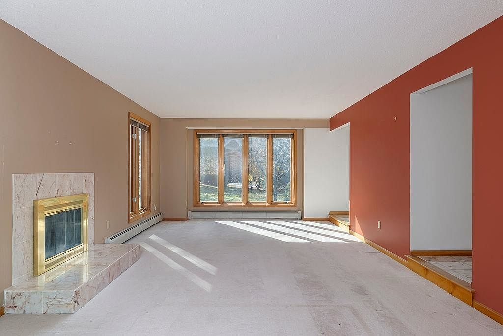 This living room features a spacious layout with neutral beige walls complemented by a striking red accent wall. Natural light floods in through large, multi-pane windows, casting soft shadows on the plush, light-colored carpet. A modern fireplace with a sleek gold trim serves as a focal point, harmonizing with the room’s warm color palette. The architectural details include elegant wood window frames and baseboards that enhance the cozy atmosphere. A step down leads to an adjoining space, offering a seamless transition. Overall, the design emphasizes warmth, simplicity, and a welcoming environment for relaxation.