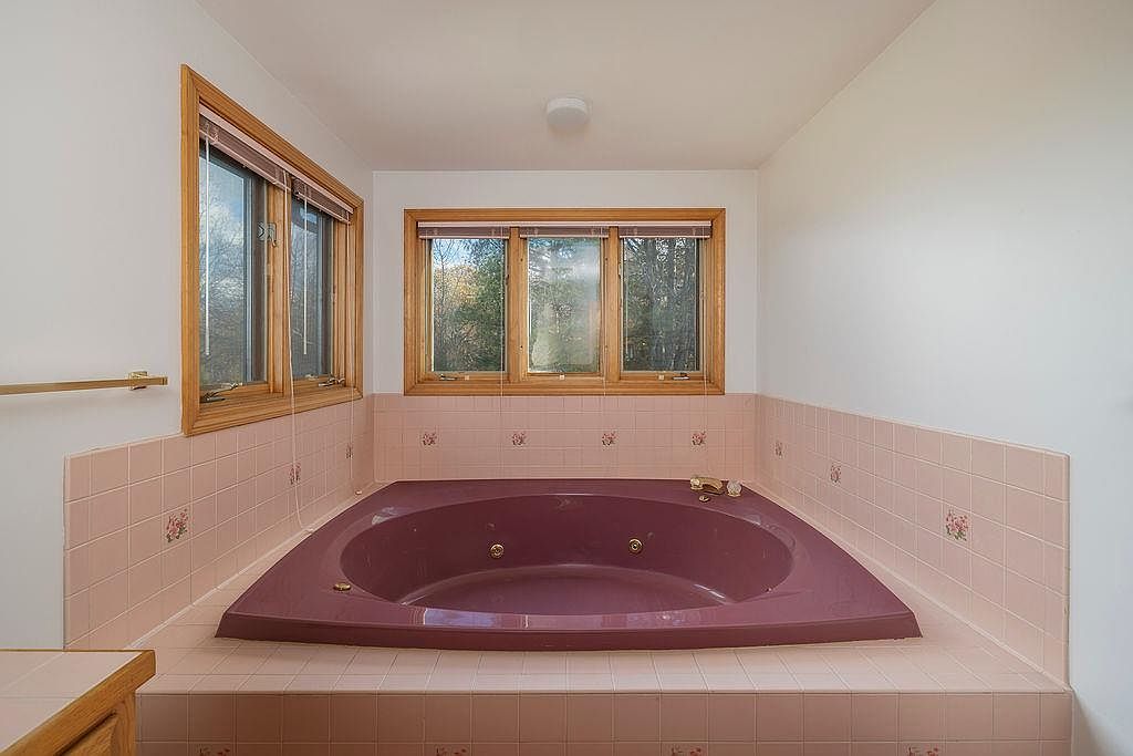 A spacious bathroom featuring a luxurious spa tub accented in rich burgundy against a light pink tiled backdrop. The semi-circular tub is set into a raised platform, surrounded by matching pink tiles adorned with delicate floral motifs. Natural light flows through three wooden-framed windows, enhancing the airy atmosphere. The cabinetry is light wood, adding warmth to the design. The walls remain mostly white, contributing to a clean and serene ambiance. Strategic placement of the windows offers views of the outdoors while providing ample lighting, making this space an inviting area for relaxation.