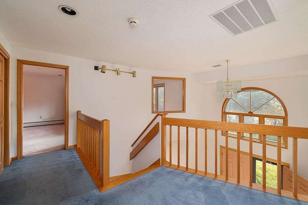 This upper landing features a spacious and bright layout with soft, light blue carpeting that adds a cozy feel. The wooden railings and stairway create a warm, inviting ambiance, complemented by the natural light filtering in through the large window adorned with an intricate arch design. A modern chandelier hangs from the ceiling, enhancing the room’s elegance. Nearby doors lead to adjacent rooms, showcasing rich wooden frames that contrast subtly with the light-colored walls. The area is well-defined, with a clear flow that connects to the staircase, enhancing accessibility while maintaining a sense of openness.