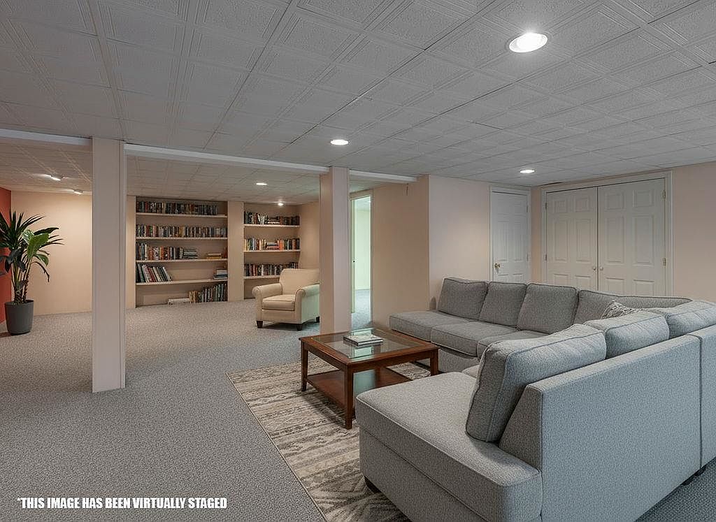 This basement space features an open layout with large sliding glass doors, allowing natural light to flood in and offering views of the outdoors. The floor is covered in a neutral-toned carpet that complements the light gray walls. Textured drop ceilings add architectural interest above, while the wooden frames of the glass doors introduce warmth. To the right, there are built-in storage closets with classic panel doors, providing practical storage solutions. A simple plastic chair sits near the door, emphasizing a casual atmosphere. Overall, the space showcases a blend of comfort and functionality with a subtle modern aesthetic.