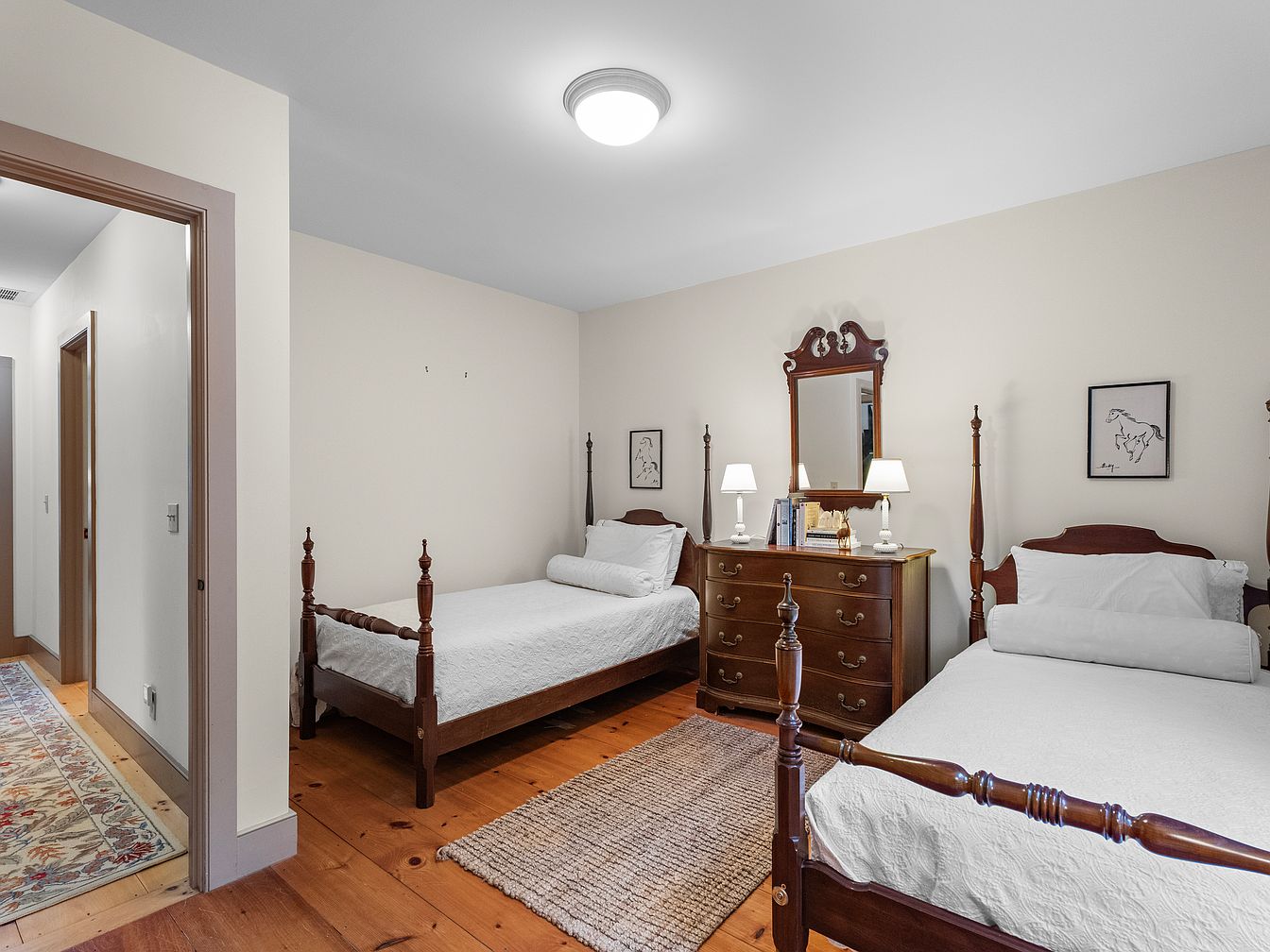 This guest bedroom features two elegant wooden beds, each with tall, intricately carved headboards and footboards. The beds are dressed in white linens, creating a clean and inviting atmosphere. A wooden dresser with ornate detailing stands between the beds, topped with bedside lamps and a few books. The walls are painted a soft beige, complementing the warm, honey-toned pine flooring. A textured woven rug adds a layer of comfort underfoot, while framed artwork accentuates the room’s charm. Natural light floods in, enhanced by the overhead light fixture, creating a cozy and welcoming space for guests.