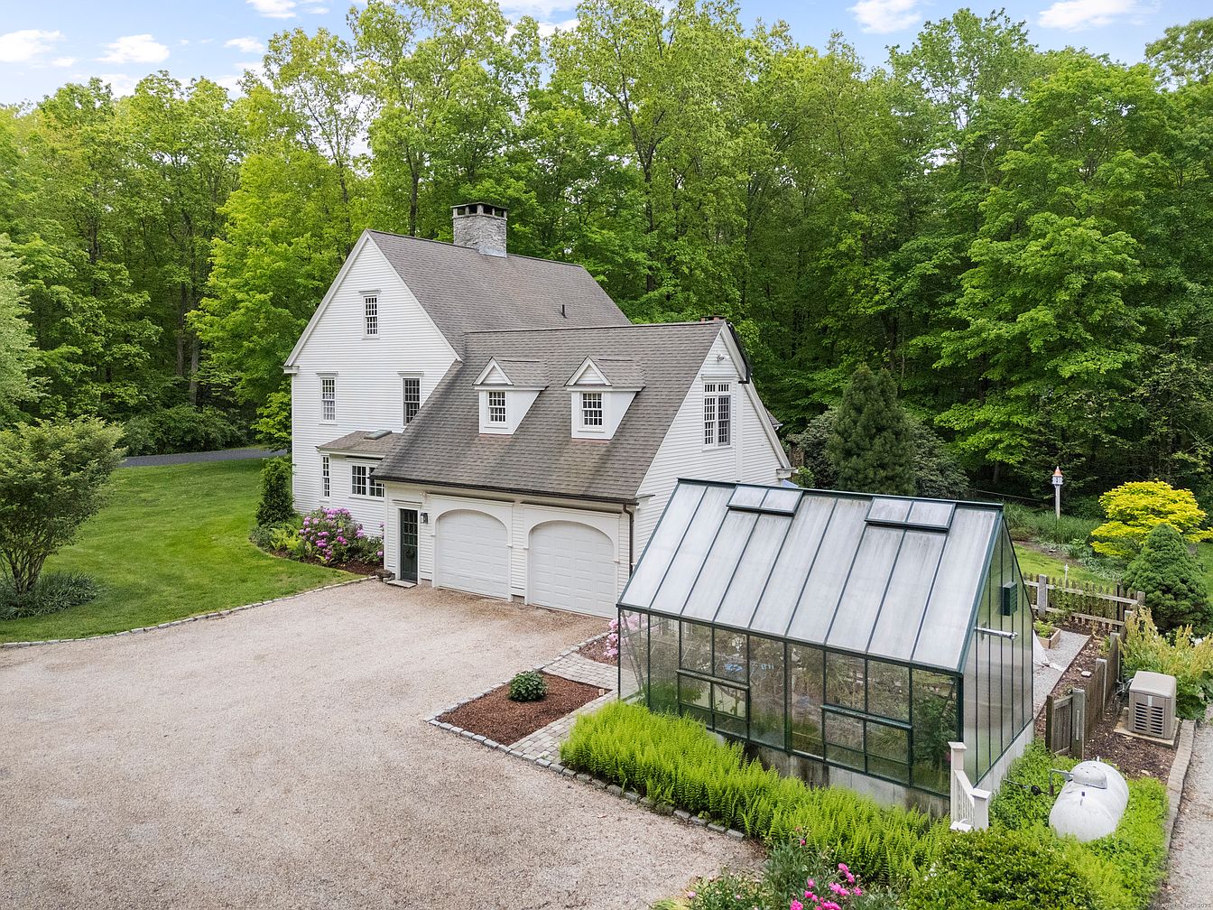 The image presents a charming historic home nestled among lush greenery. The house features classic white sidings with a steeply pitched roof adorned with traditional gables. Multiple dormer windows accentuate the upper levels, contributing to its character. A spacious gravel driveway leads to an attached two-car garage, flanked by vibrant flowering shrubs and manicured grass. To the right, a stately greenhouse with a sleek glass facade sits amidst ornamental plant beds, creating a harmonious blend of architecture and nature. Tall trees provide a serene backdrop, enhancing the peaceful, rustic atmosphere of this idyllic property.