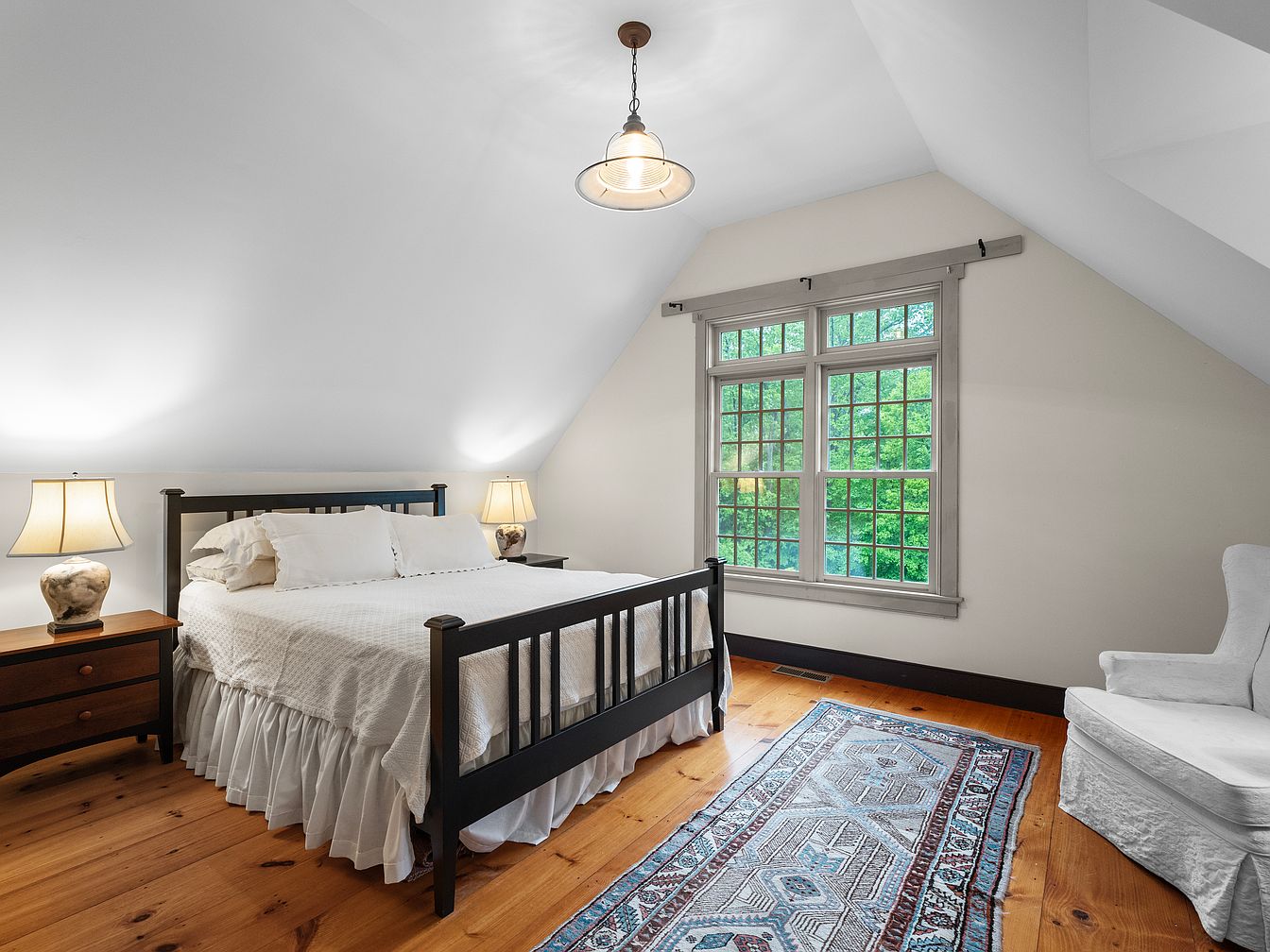 A cozy bedroom featuring a sloped ceiling and ample natural light from a large window surrounded by classic trim. The color palette is warm with soft tones of white and beige, enhancing a serene atmosphere. A dark wooden bed with a ruffled white comforter is complemented by matching bedside tables topped with elegant lamps. The polished wooden floor contrasts with a patterned area rug, adding texture and warmth. A plush, light-colored armchair sits in one corner, inviting relaxation. Decorative details maintain the historic charm, while the overall layout emphasizes comfort and tranquility.