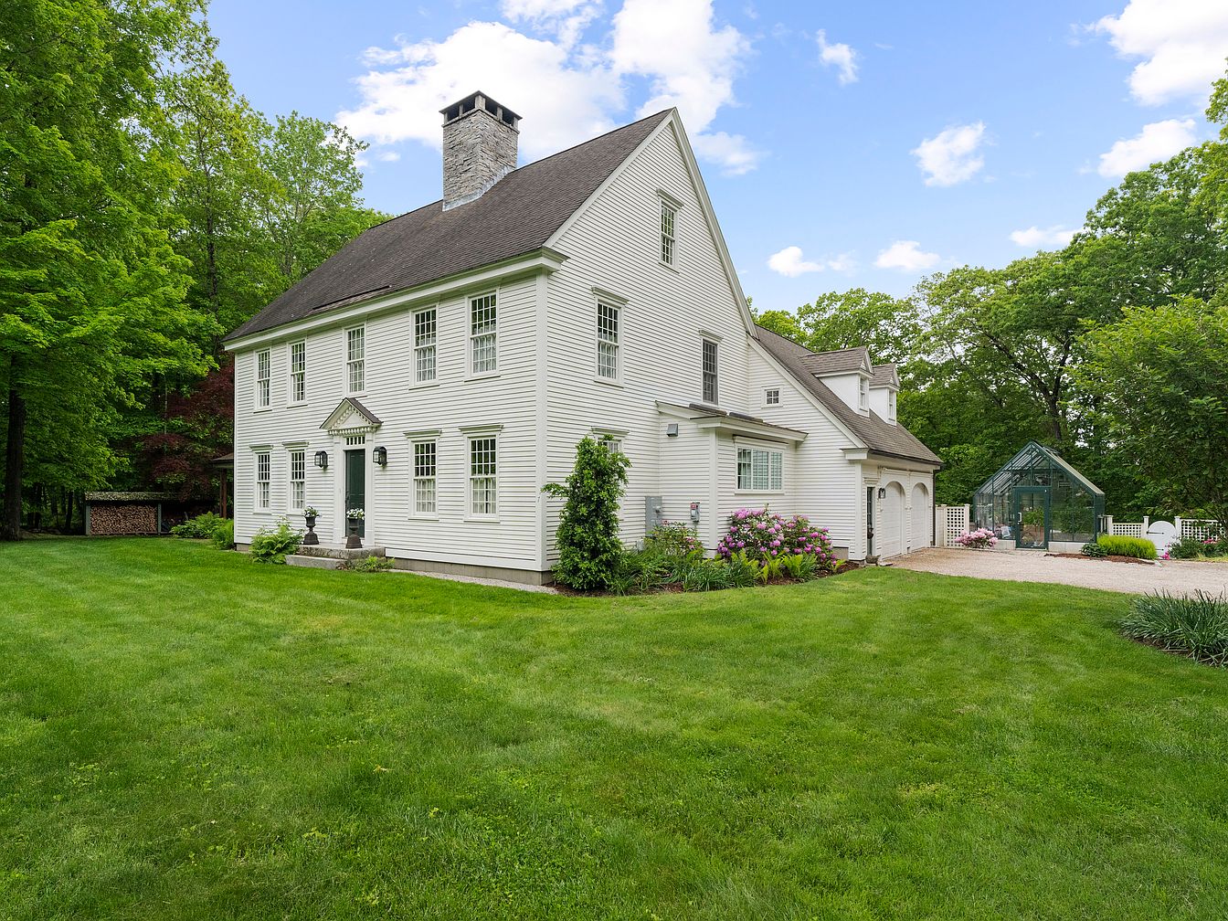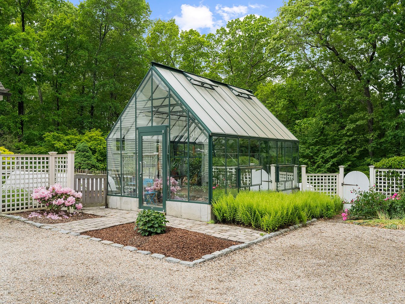 The exterior showcases a charming historic American home featuring a gabled roof and white clapboard siding. Symmetrical windows framed in dark green add a classic touch, while elegant lanterns flank the main entrance, enhancing its inviting appeal. Lush green lawns surround the house, dotted with colorful flowering shrubs, creating a vibrant atmosphere. A stone chimney rises prominently against the backdrop of trees, hinting at a warm interior. Adjacent to the house, a striking glass greenhouse complements the garden space, offering a modern contrast to the traditional architecture, while gravel pathways lead to landscaped areas, accentuating the property’s tranquil beauty.