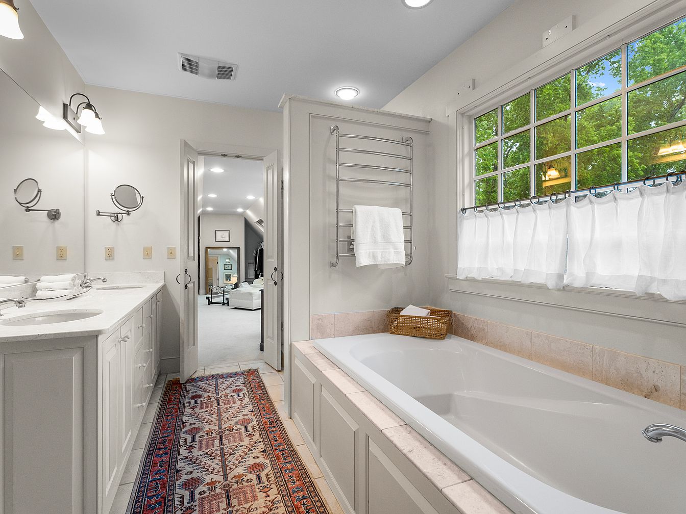 This bathroom showcases a bright and airy atmosphere with a neutral color palette of soft whites and light grays. A dual vanity with pristine white countertops is flanked by elegant wall-mounted mirrors and stylish light fixtures. A large window offers ample natural light, framed by sheer white curtains. The freestanding bathtub, set against a tiled wall, enhances the space’s tranquil vibe. A decorative rug with intricate patterns adds warmth and character underfoot. Features like a towel rack and a decorative basket complete the layout, creating an organized and inviting environment ideal for relaxation.