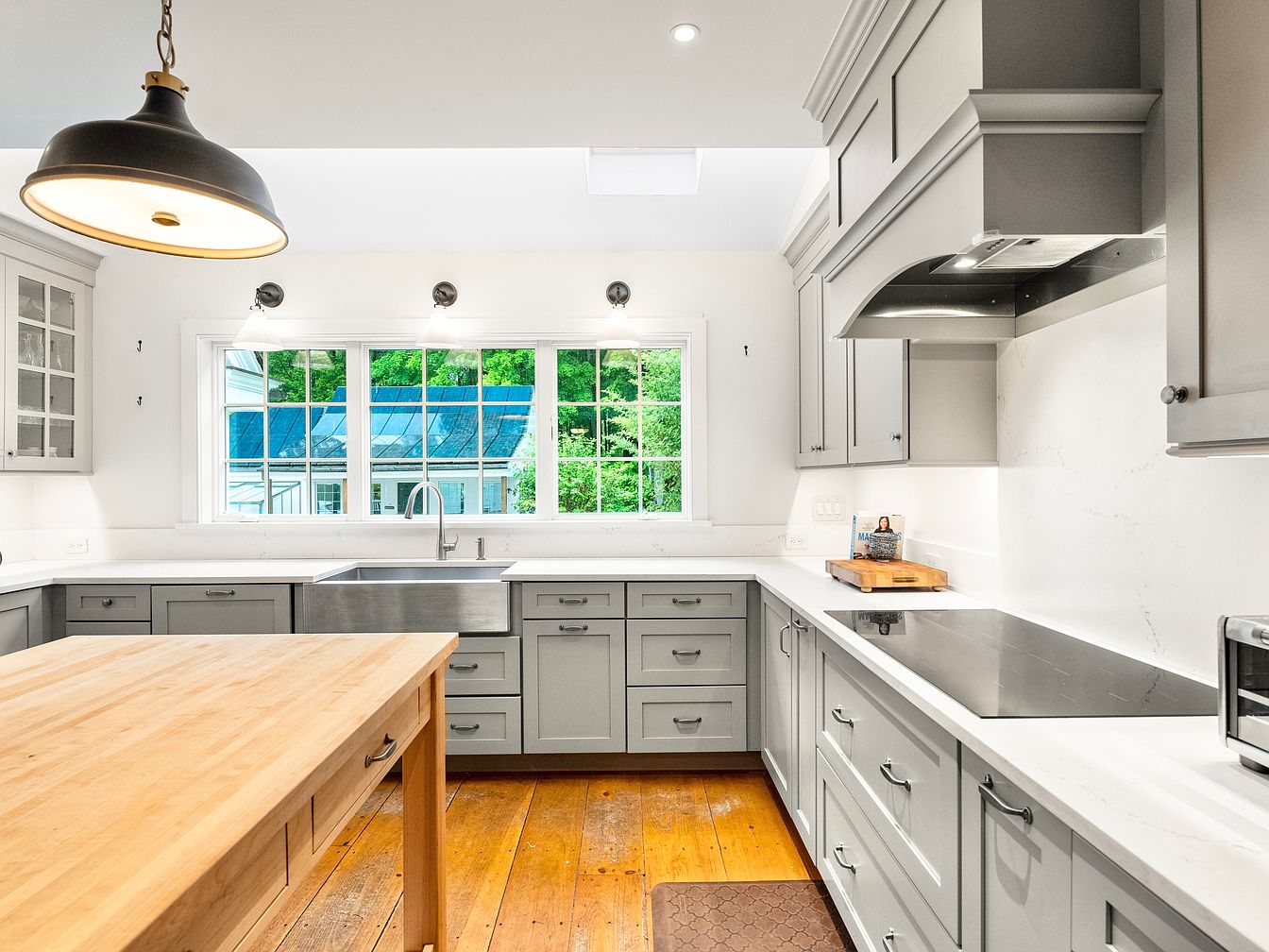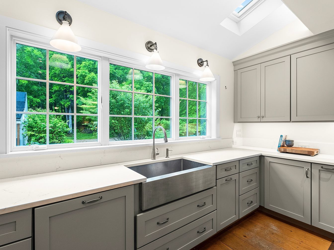 The kitchen features sleek, grey cabinetry with minimalist handles, creating a modern yet classic aesthetic. A spacious farmhouse sink is positioned beneath large, dual-pane windows that flood the area with natural light, showcasing verdant outdoor views. The countertops are white with subtle veining, enhancing the clean look. Above, stylish pendant lighting adds warmth, contributing to the inviting atmosphere. Wooden flooring introduces a hint of rustic charm, complementing the contemporary design. A skylight enhances brightness and airiness, making the space feel open and welcoming. This kitchen harmonizes functionality with elegant design elements.