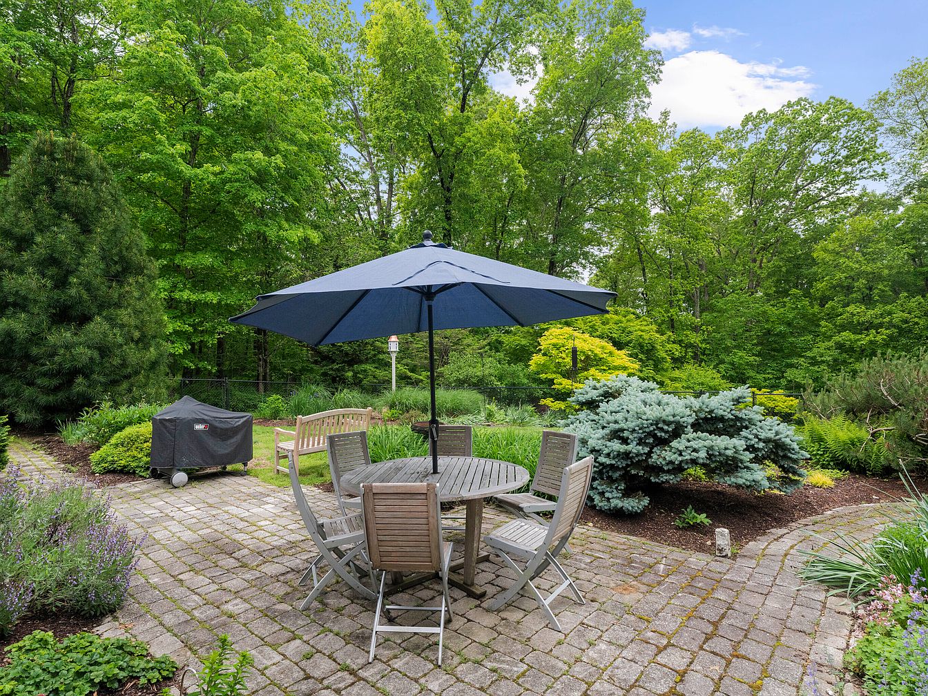 This patio area features a round wooden table surrounded by six light-colored chairs, offering a casual dining space. A large, navy blue umbrella provides shade, enhancing the inviting atmosphere. The flooring consists of neatly arranged, rustic stone pavers, which complement the natural surroundings. A charcoal grill sits discreetly in one corner, ideal for outdoor cooking. Lush greenery and ornamental shrubs frame the patio, creating a serene backdrop of vibrant leaves and textures. The variety of plant life adds visual depth, while the open sky above invites natural light, enhancing the overall peaceful ambiance.