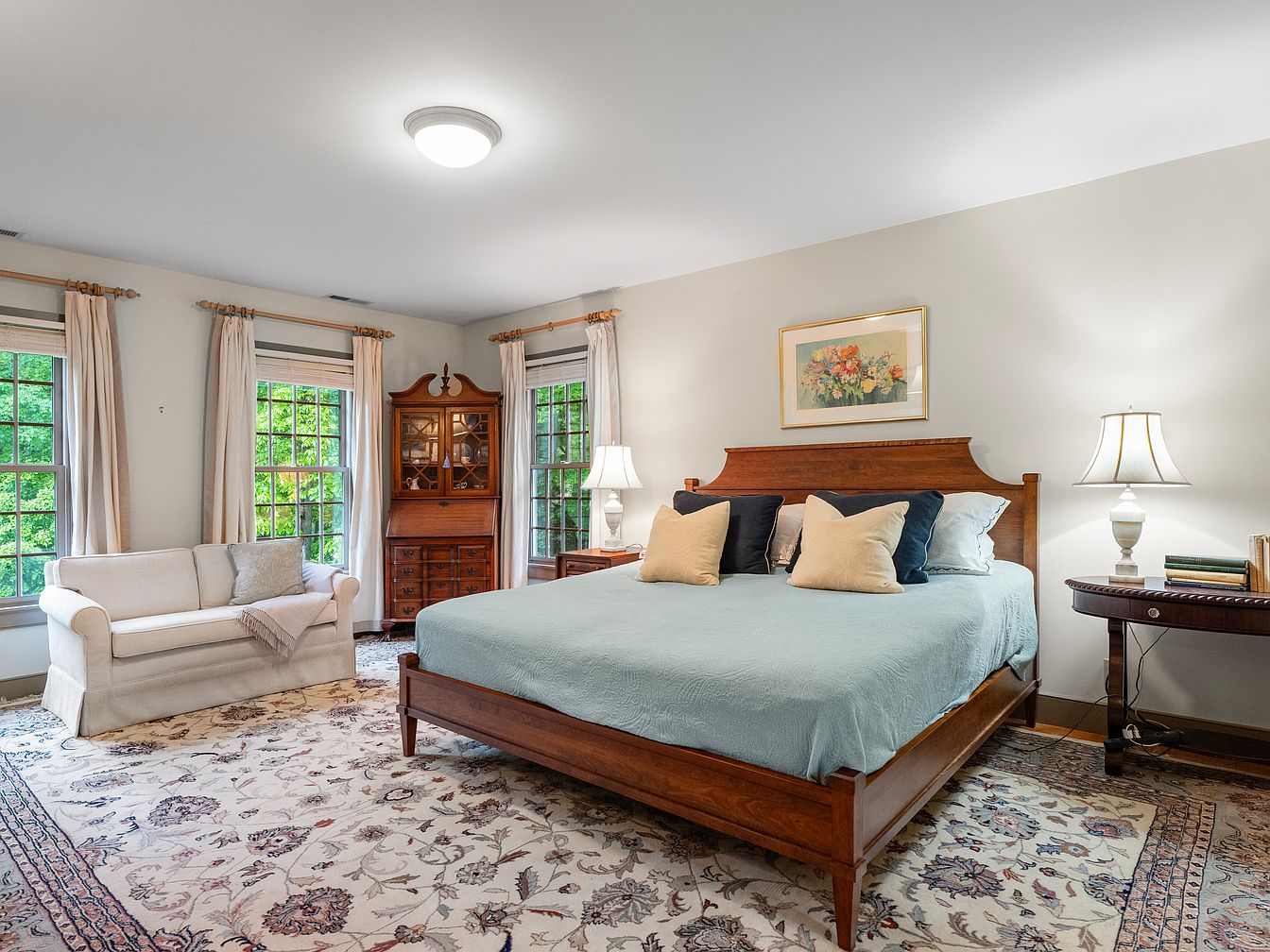 The space exemplifies a serene bedroom atmosphere, featuring a wooden bed with a soft blue coverlet. Two plush pillows adorned with light tones create an inviting focal point. A neutral area rug showcases intricate floral patterns, adding warmth. The walls, painted in a soft hue, complement the room’s tranquility. Large windows dressed with elegant drapes allow natural light, enhancing the airy feel. A cozy loveseat sits in one corner, inviting relaxation, while a vintage chest of drawers adds character. Two bedside lamps offer soft illumination, and a floral artwork above the bed enriches the aesthetic harmony.