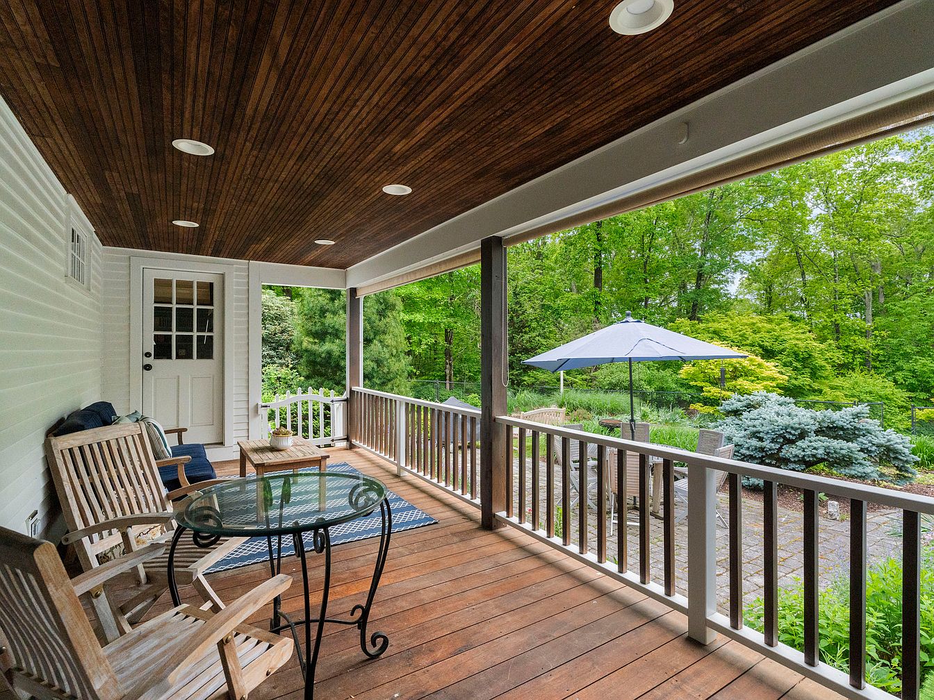 A welcoming front porch features warm wooden flooring and a richly stained ceiling that adds depth and character. Comfortable wooden rocking chairs are positioned around a glass-topped table, inviting relaxation. The space is framed by stylish railings, allowing views of a lush garden outside. A potted plant creates an accent on the table. Natural light floods the area, enhancing the earthy color palette of browns and greens. A doorway with a grid-paneled design provides entrance to the home. The atmosphere is tranquil, perfect for enjoying a morning coffee or an afternoon read amid nature.