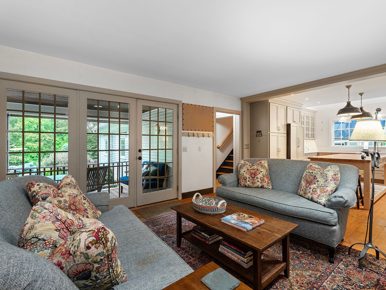 This cozy living room features a harmonious blend of vintage and modern styles. Soft gray upholstered sofas adorned with floral-patterned cushions invite relaxation, while a warm wooden coffee table adds a rustic touch. Natural light pours in through French doors, offering views of the lush outdoors. The flooring is a rich wooden hue, complemented by a vibrant area rug that provides texture and warmth. Adjacent to the seating area, a stylish floor lamp and sleek cabinetry enhance functionality. The open layout flows seamlessly into the kitchen area, maintaining an inviting and spacious atmosphere throughout the home.