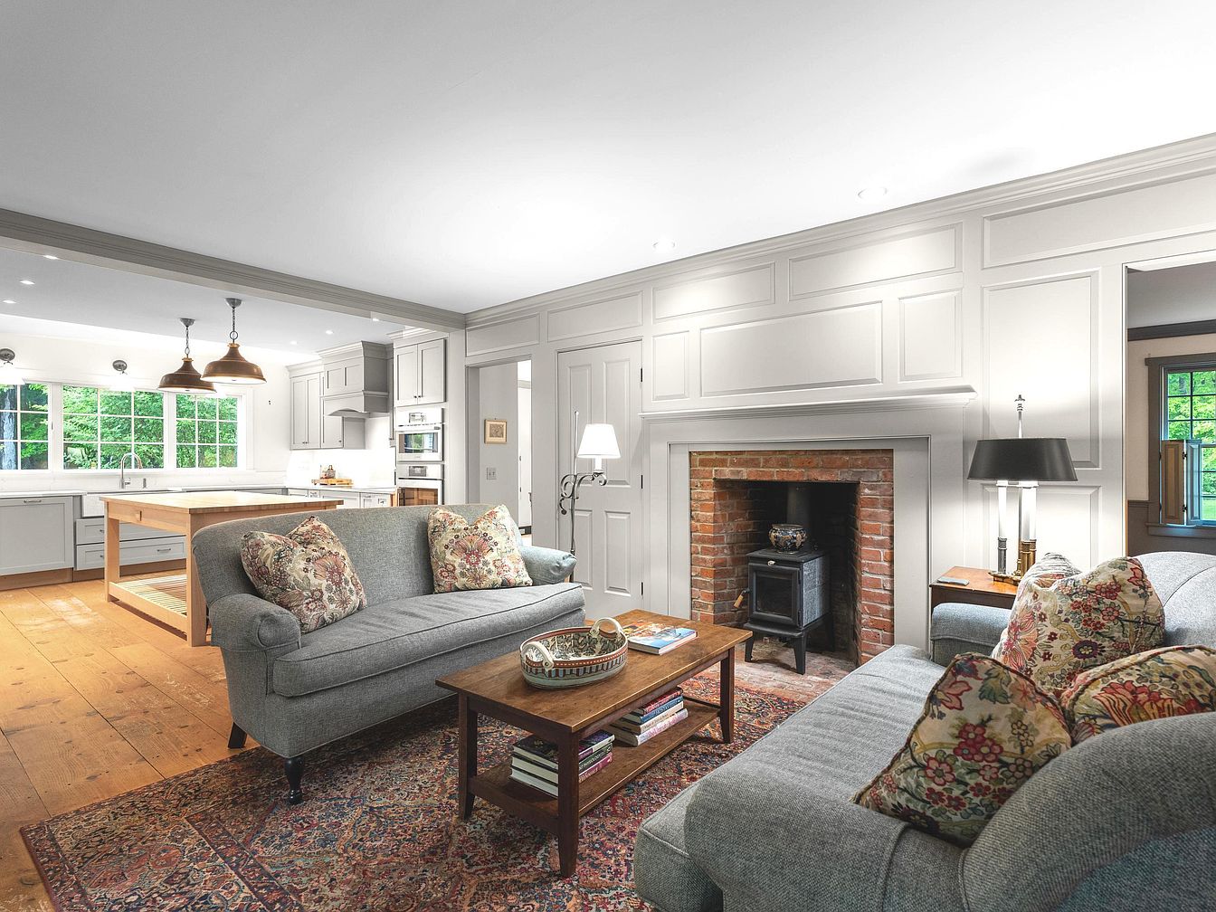 This inviting living room features a blend of modern and traditional design elements. The pale grey walls are complemented by intricate wainscoting, adding a touch of sophistication. A cozy grey couch adorned with patterned throw pillows faces a rustic wooden coffee table, surrounded by an ornate area rug that introduces warmth. The focal point is a classic brick fireplace, housing a sleek black stove for an intimate ambiance. Natural light floods in from large windows, enhancing the airy feel of the space. Pendant lights above the open kitchen create functional elegance, harmonizing with the overall aesthetic.